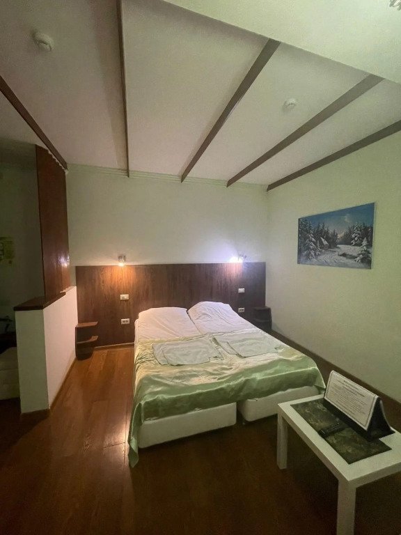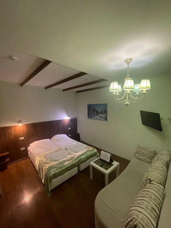 2-спальная кровать, прикроватные тумбочки, шкаф, стулья, сейф, ТВ, с/у с ванной. Стойка для лыж.