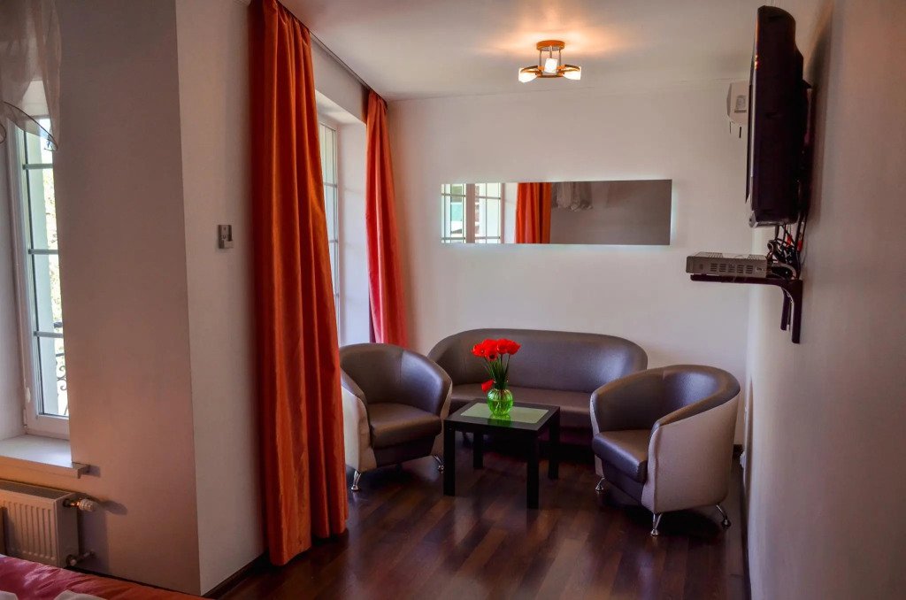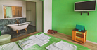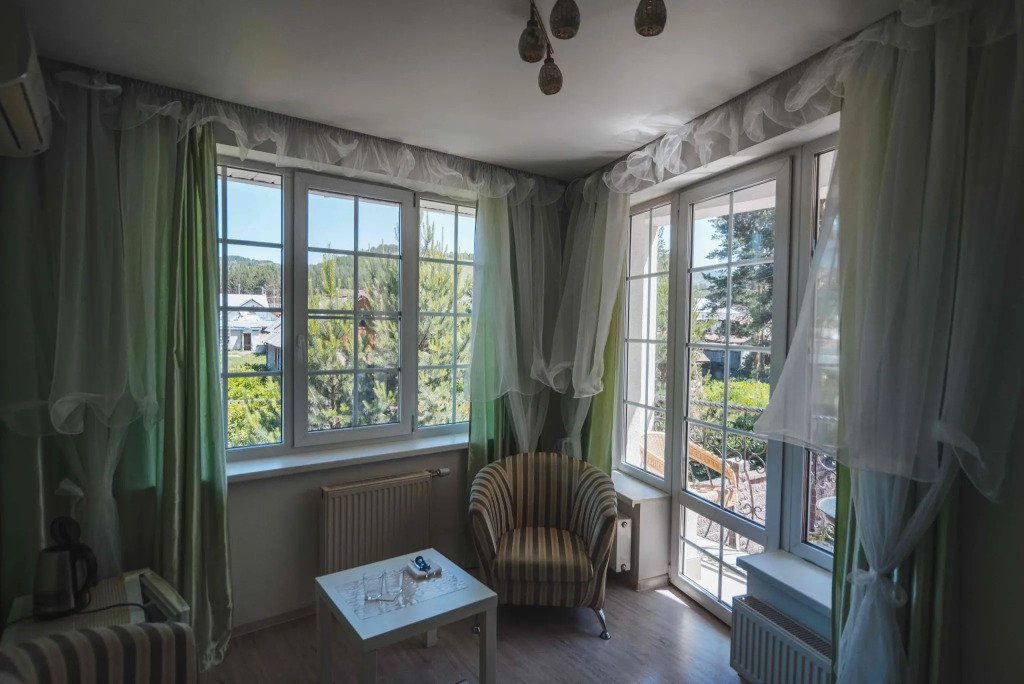 36 кв.м, 2-спальная кровать, ТВ, Х, сейф, дополнительное место — диван, вид на сад. С/у душ.