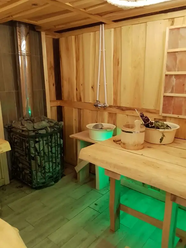 Инфраструктура: зона отдыха, полотенца, шапочки, душПомимо оздоровления, баня — это отдых для души. В настоящей бане, услышав треск горящих дров и ощутив ароматный травяной запах пара, действительно начинаешь думать о философии жизни.