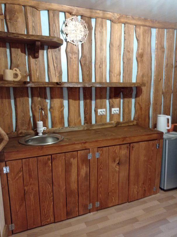 В домике двухспальная кровать и раскладной диван. Кухонька, холодильник, вентилятор, чайник, микроволновка. Душ и санузел.