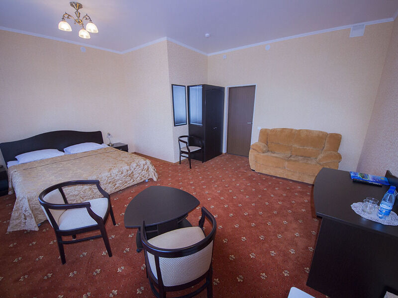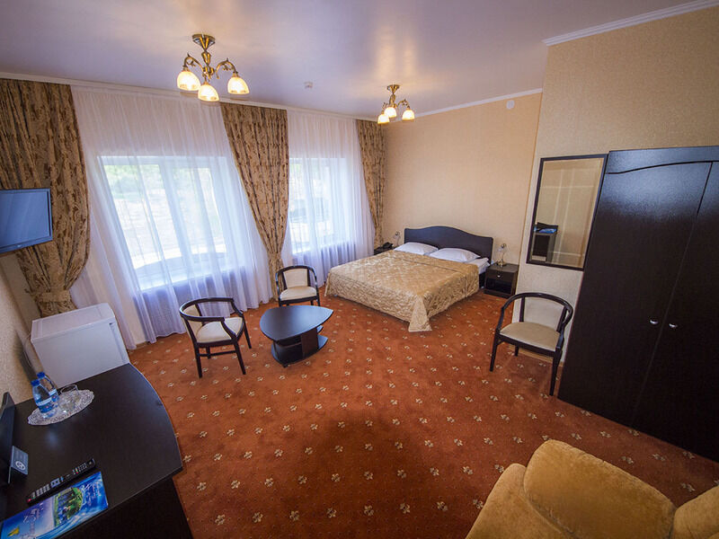 36 кв.м, двуспальная кровать, диван, шкаф, прикроватная тумбочка, сейф, с/у с душем, ТВ, мини-холодильник, столик с необходимым набором посуды, чайник.