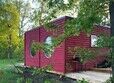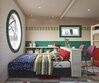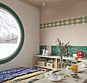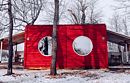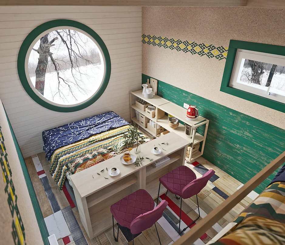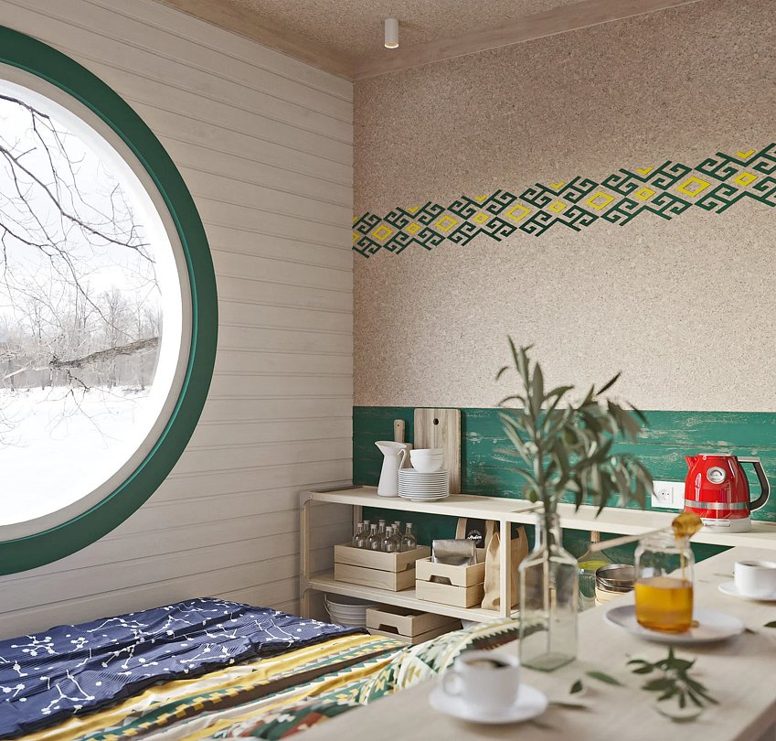 Деревянный дом с круглым окном, через которое открывается вид на панораму берега озера, идеально подходит для семейного отдыха.