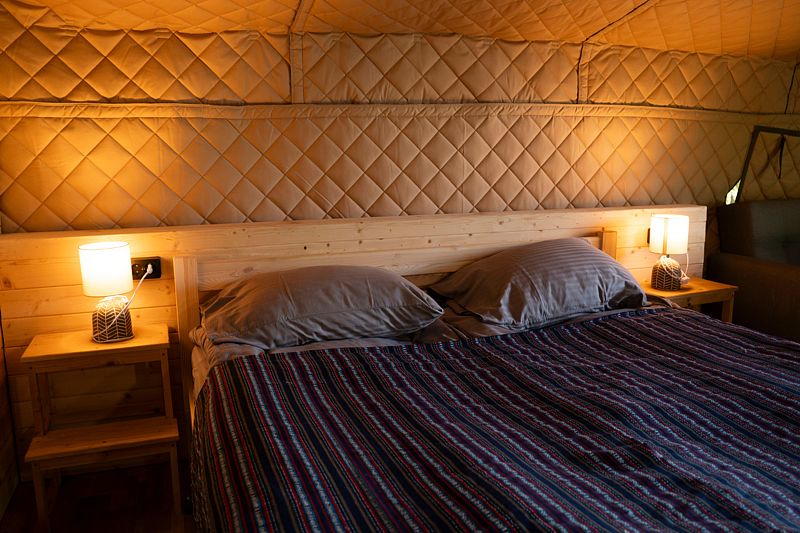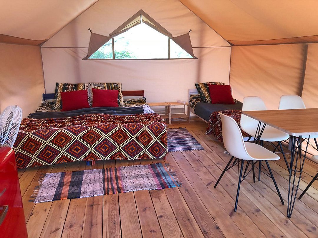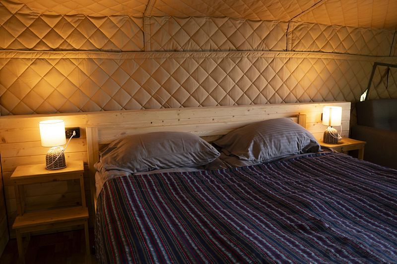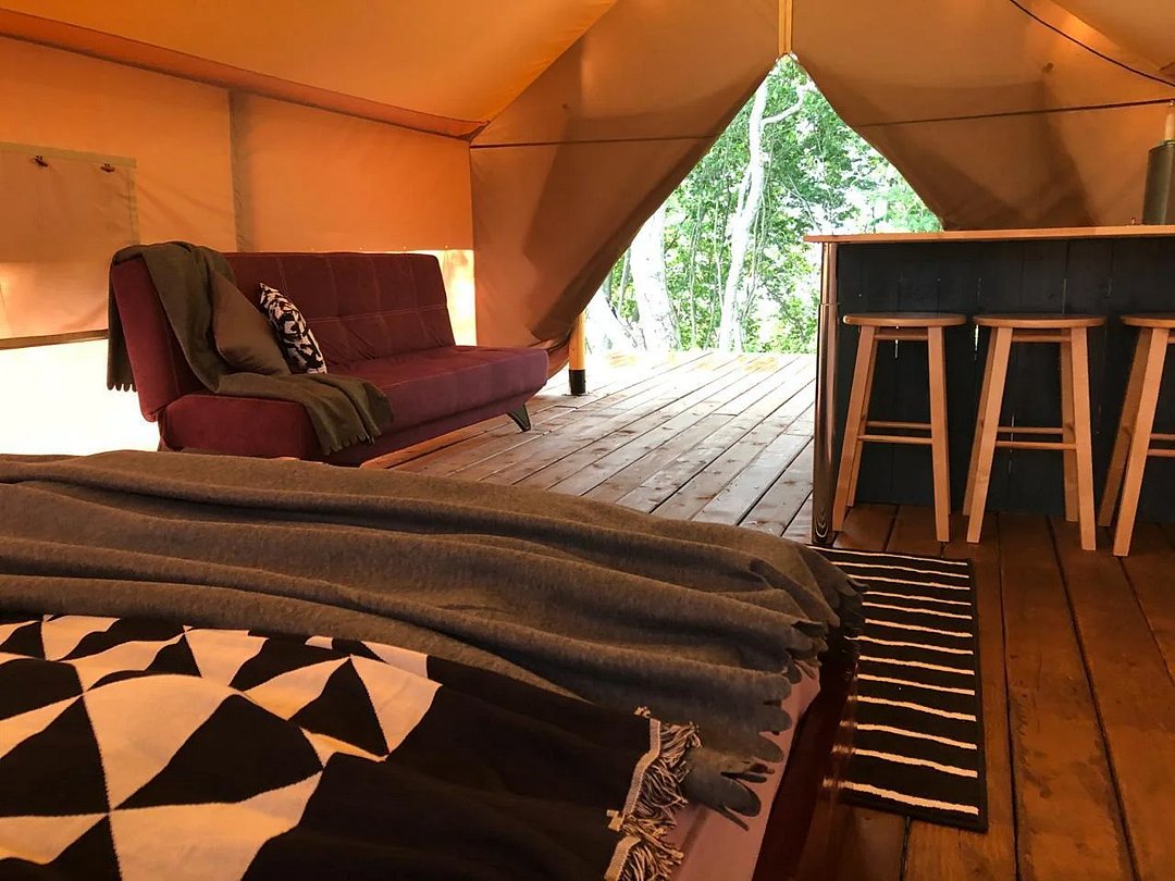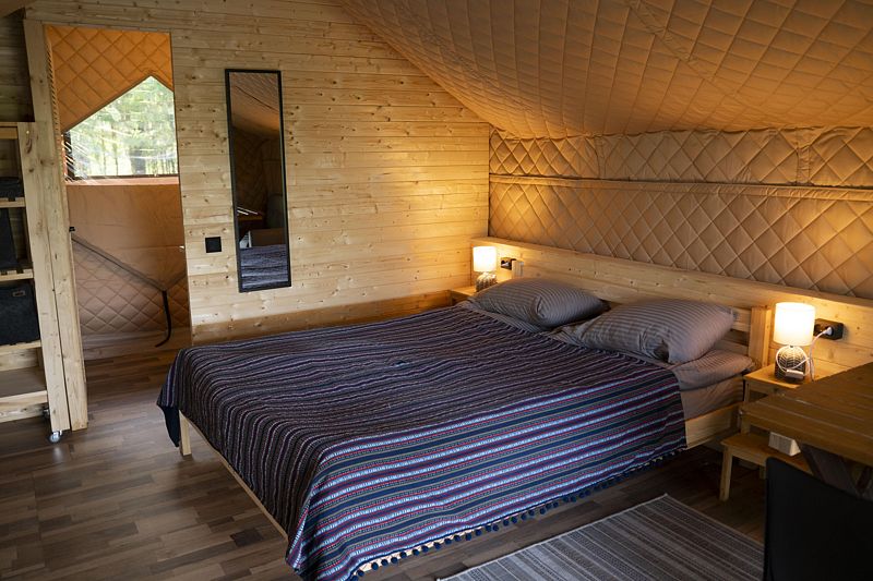 Это место для комфортного отдыха со всеми удобствами гостиничного номера, где ничто не мешает наслаждаться природой. Вместо спальных мешков у гостей есть комфортабельные кровати с матрасами и простынями.