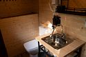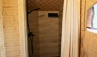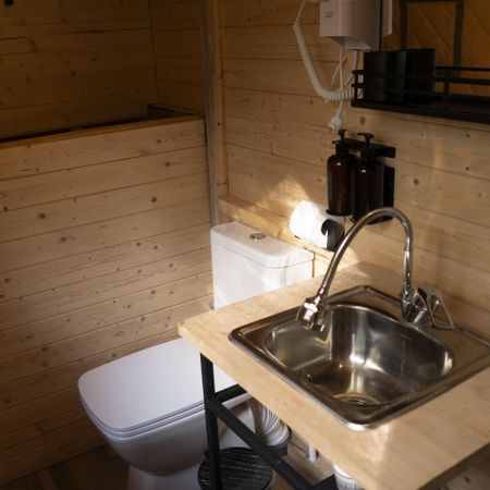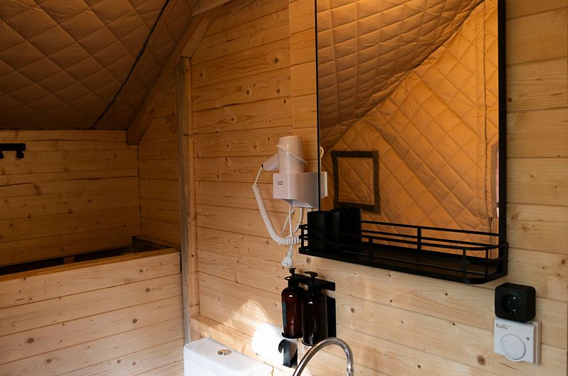 При заезде гостям выдается ключ от индивидуальной душевой кабины и уборной, которые расположены в отдельном сооружении на берегу озера, на расстоянии минуты ходьбы от платформы, на которой расположен номер.