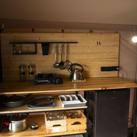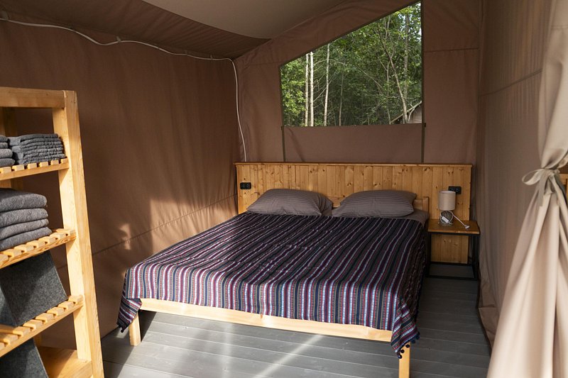 Комфортабельная палатка включает в себя спальную зону с тремя кроватями, гардеробной, мини-кухню и террасу с видом на водную гладь.