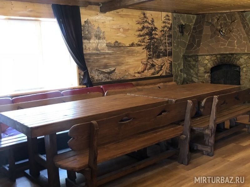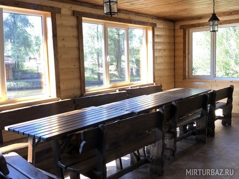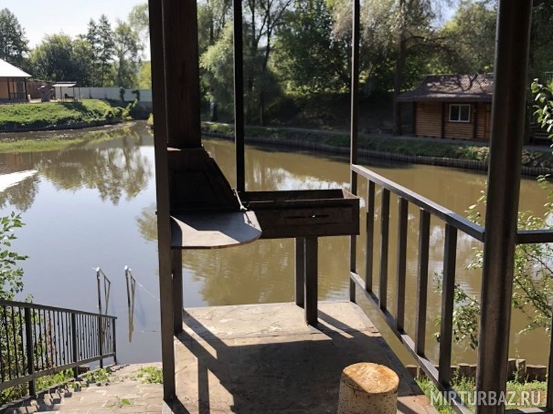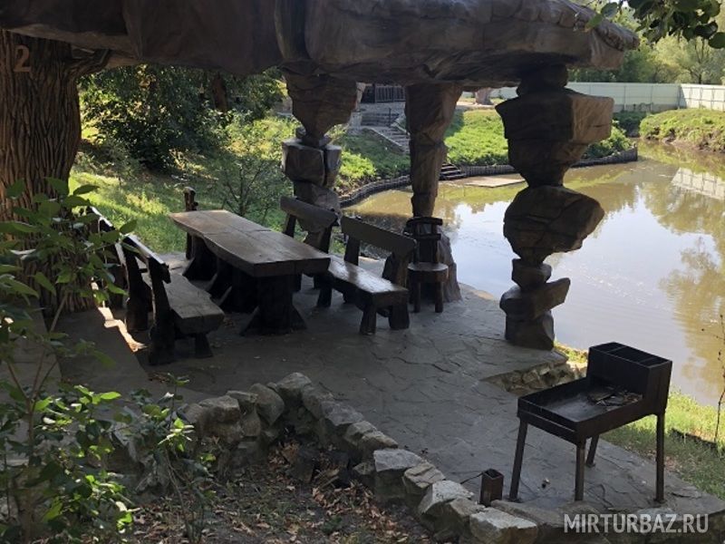- теплая беседка-сруб на берегу пруда с мангалом, обеденным залом и пикниковой площадкой;