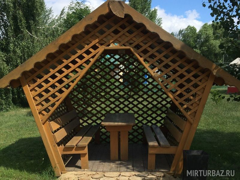 На территории расположено несколько уютных деревянных беседок различной вместимости для комфортного отдыха на свежем воздухе.