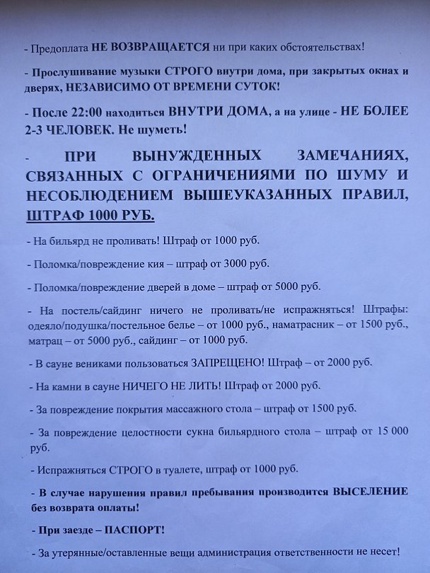 Администрация в праве отказать в заселении без объяснения причин. После 22:00 находиться внутри дома, а на улице - не более 2-3 человек. Требуется соблюдать тишину и придерживаться правил проживания.