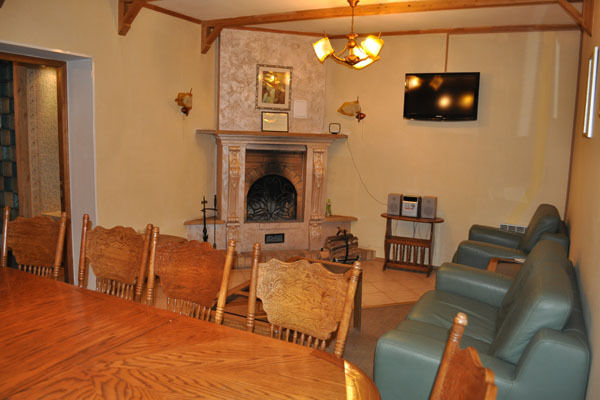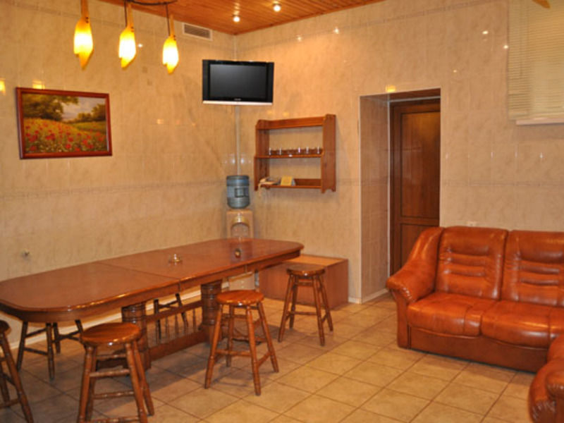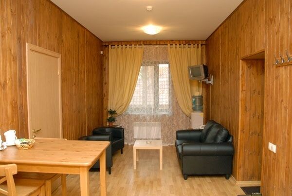 В комнате для отдыха имеется большой деревянный стол, мягкая кожаная мебель, телевизор и кулер. К Вашим услугам - тапочки, полотенца, простыни и шапочки для бани и фен.