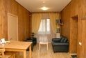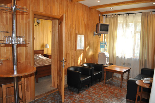 оснащена мягкой мебелью, телевизором, кулером для подачи воды, мини-холодильником, а так же из двух спальных комнат: одна - с большой двуспальной кроватью, а другая - с двумя односпальными кроватями. Ванная комната совмещенная с сан. узлом.