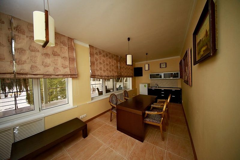 Второй номер данной категории (42) размещен на четвертом, мансардном, этаже гостиницы. Балкон с видом на уютный двор и парковую зону комплекса с многолетними дубами, пешеходными дорожками и беседками.