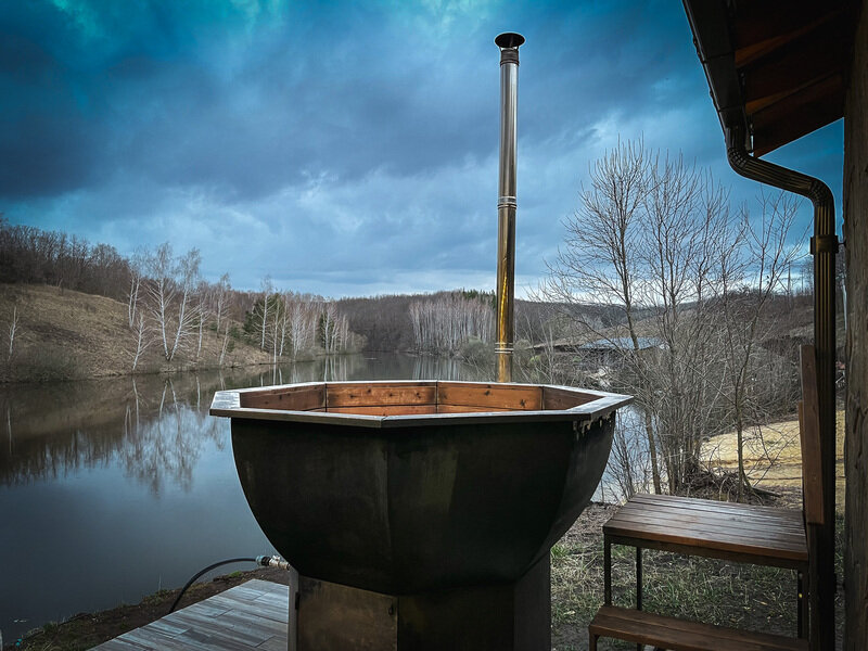 Сауна с паром и прекрасным панорамным видом. Горячее джакузи с еловыми ветками и ароматными маслами. И все это в окружении природы. Сеанс длится 3 часа.