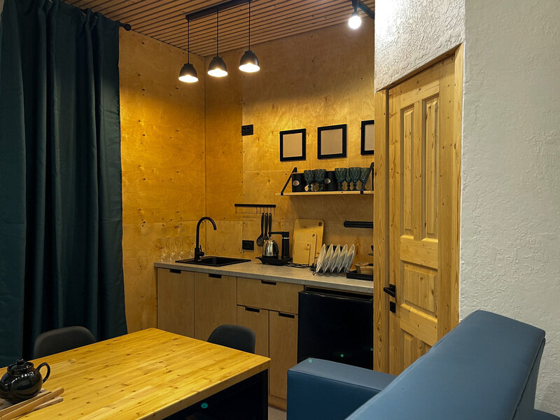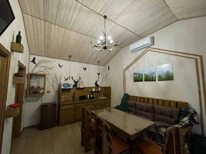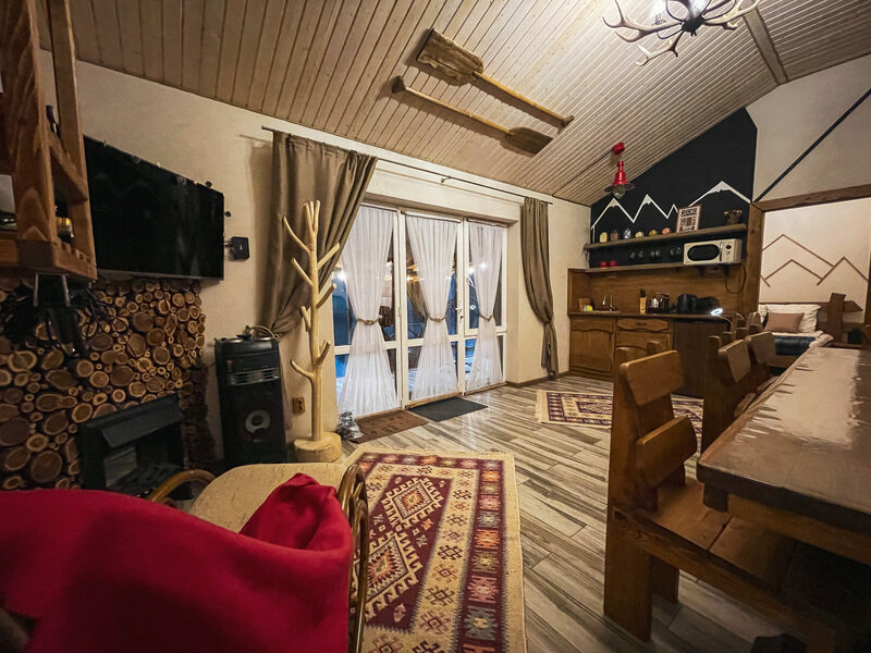 В гостиной зоне можно погреться у камина, расположившись на диван-кровати, раскладывающейся в отдельное двуспальное место. Имеется санузел. Домик отапливается и оснащен системой климат-контроля.