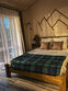 Спальная комната с двуспальной кроватью имеет неповторимый вид на озеро.