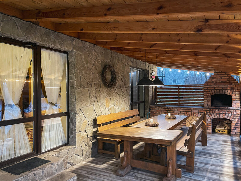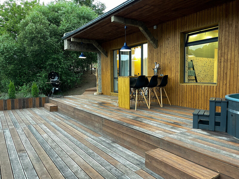 На террасе домика есть мангальная зона, отдельно стоит выделить джакузи.