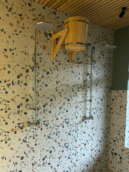 Сердцем шале является русская баня на дровах, банный чан на террасе и холодная купель.