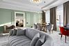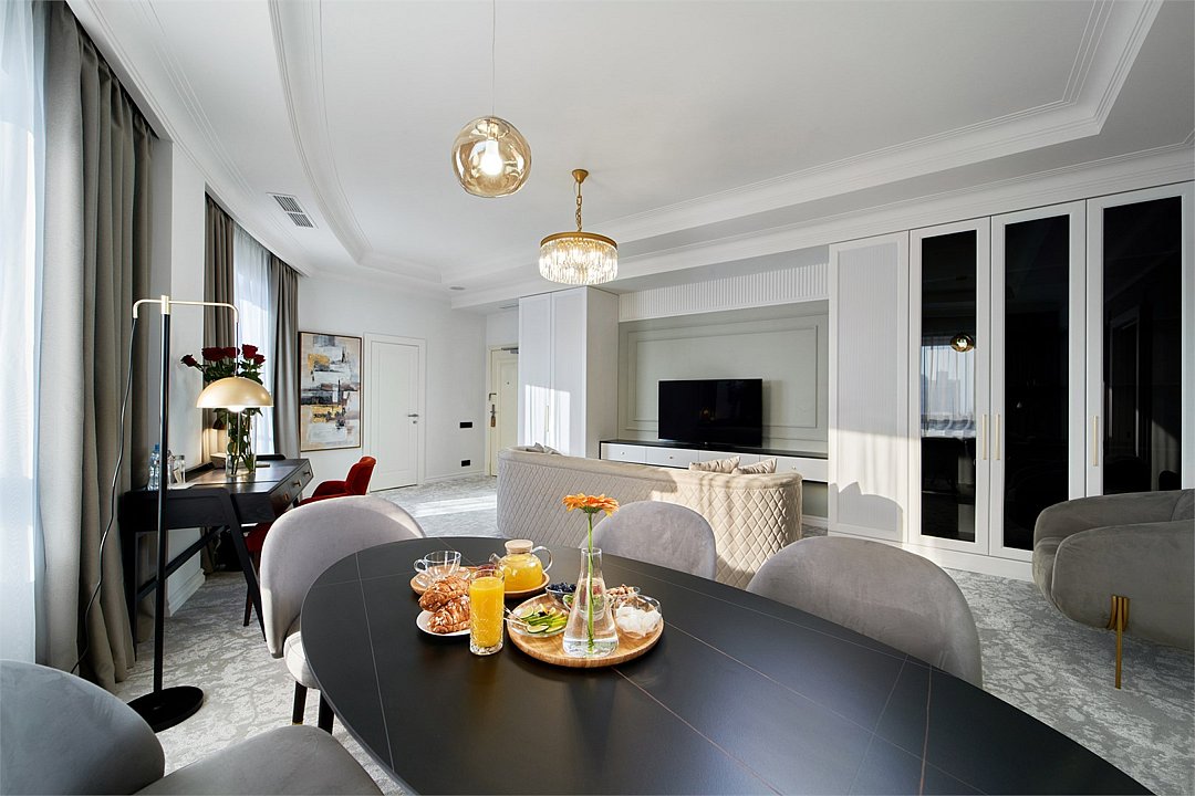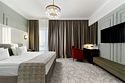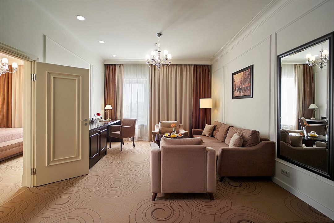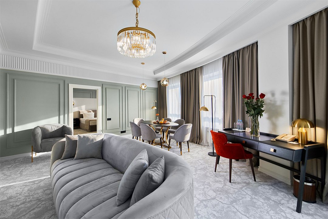 два телевизора, Wi-Fi, телефон, холодильник, кондиционер, настольные лампы, фен, электронные замки, утюг, ванна, халаты, банные полотенца, тапочки, косметические средства, кровать «King size», гладильная доска, ортопедический матрас, диван, кресла, стулья, шкаф для одежды, журнальный столик, письменный стол, багажная тумба, две комнаты, звуконепроницаемые стены и окна, мини-бар, письменные принадлежности, чайный набор, обслуживание номеров, информационная карта, меню, сейф, чайник, мягкая мебель, косметическое зеркало, питьевая вода, гостиная зона, ковровое покрытие, вид на городВ гостиничном номере
