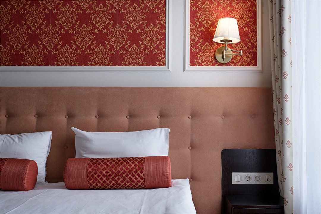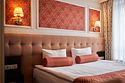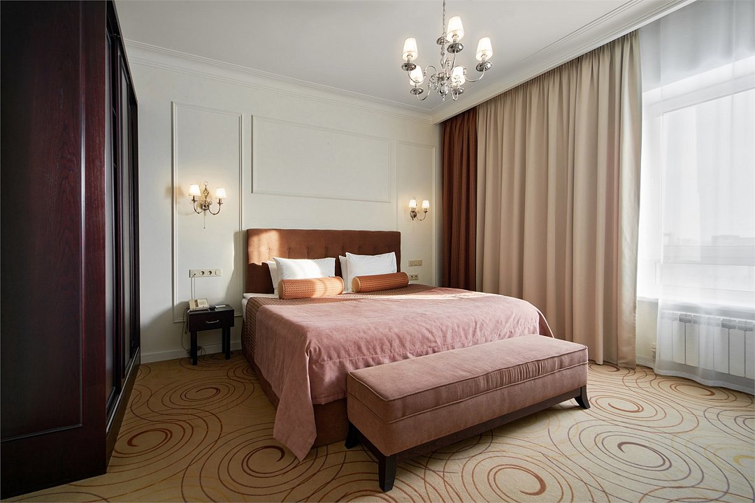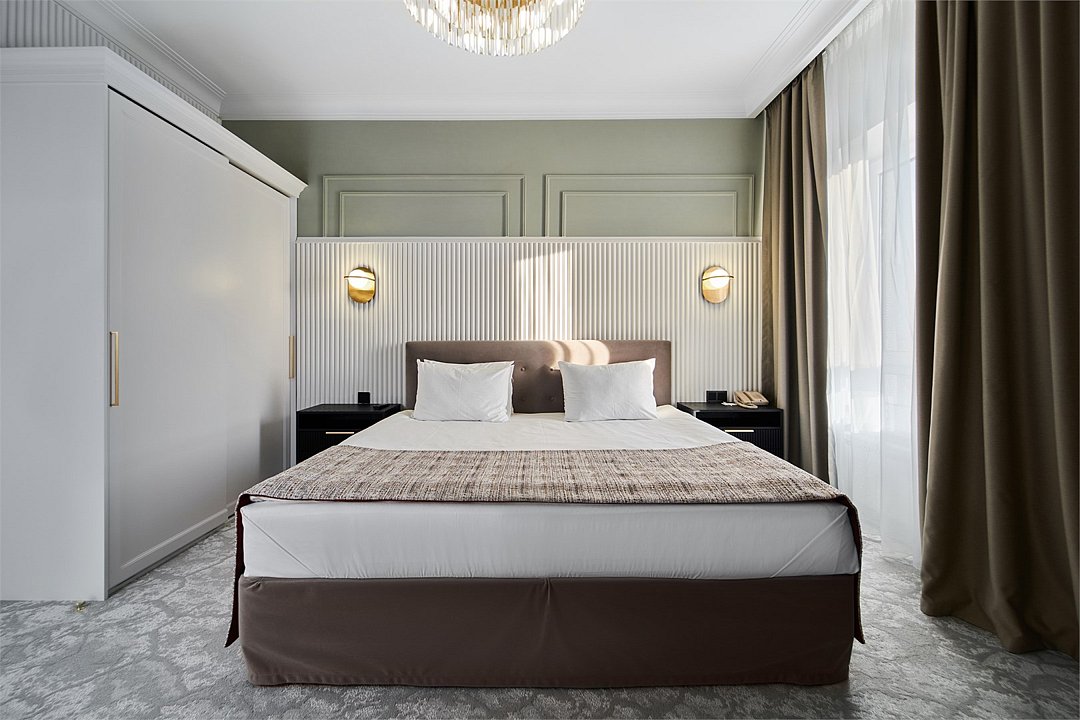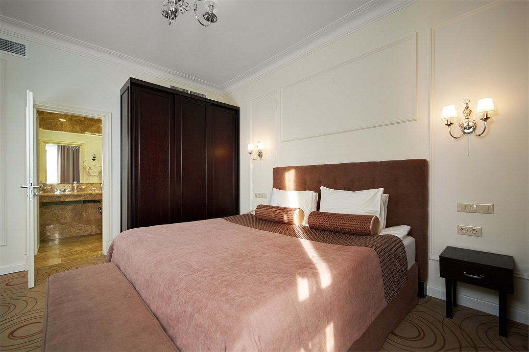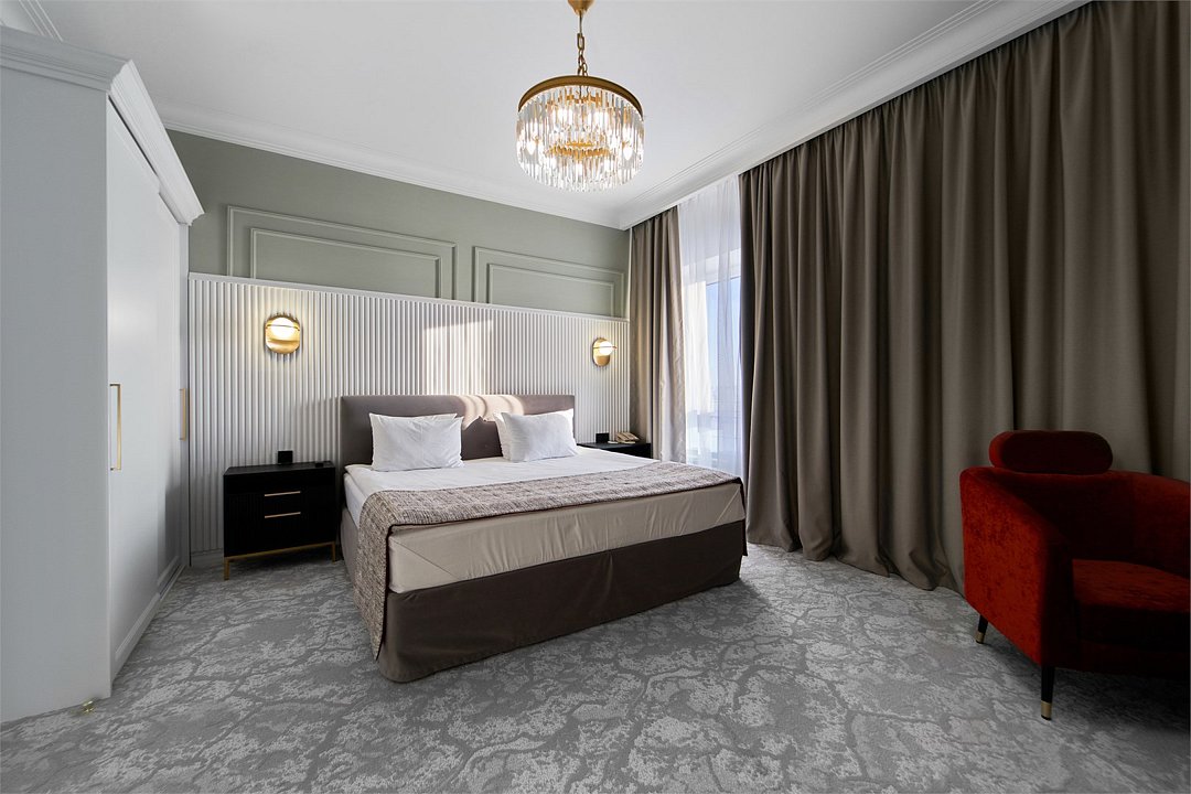 «Люкс» — двухкомнатный номер общей площадью 50 м², состоящий из спальни и гостиной. Спальная комната оснащена широкой кроватью 200 см с ортопедическим матрасом и прикроватными тумбочками, косметическим столиком с зеркалом, большим платяным шкафом для одежды, LCD-телевизором и кондиционером. В гостиной комнате удобный диван с креслами, рабочий стол и LCD-телевизор. Ванная комната, отделанная мрамором, имеет полноценную ванну. Звукоизолирующие окна со шторами black-out не позволят нарушить ваш безмятежный сон.Услуги и удобства