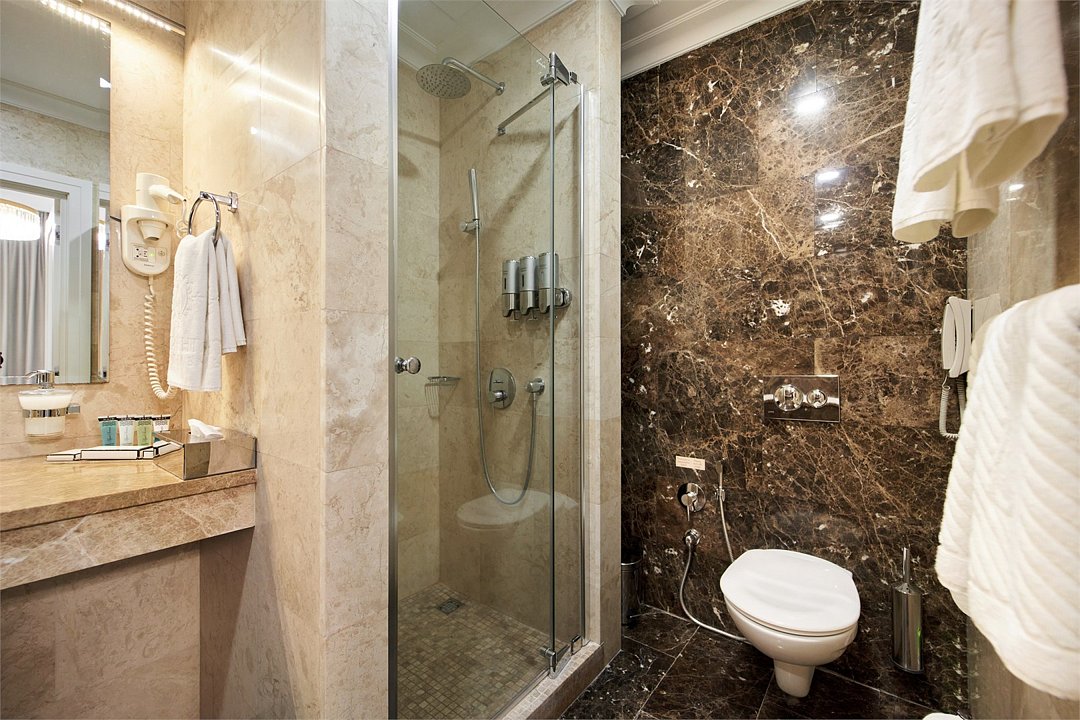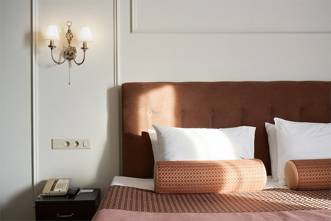 «Стандартный» — уютный однокомнатный номер площадью 19 м² с широкой кроватью 180 см или двумя отдельными кроватями 90 см и прикроватными тумбочками. В каждом номере удобный косметический столик с зеркалом и большой платяной шкаф. Ванная комната, отделанная мрамором, и душевая кабина с тропическим душем. Звукоизолирующие окна со шторами black-out не позволят нарушить ваш безмятежный сон.Услуги и удобства