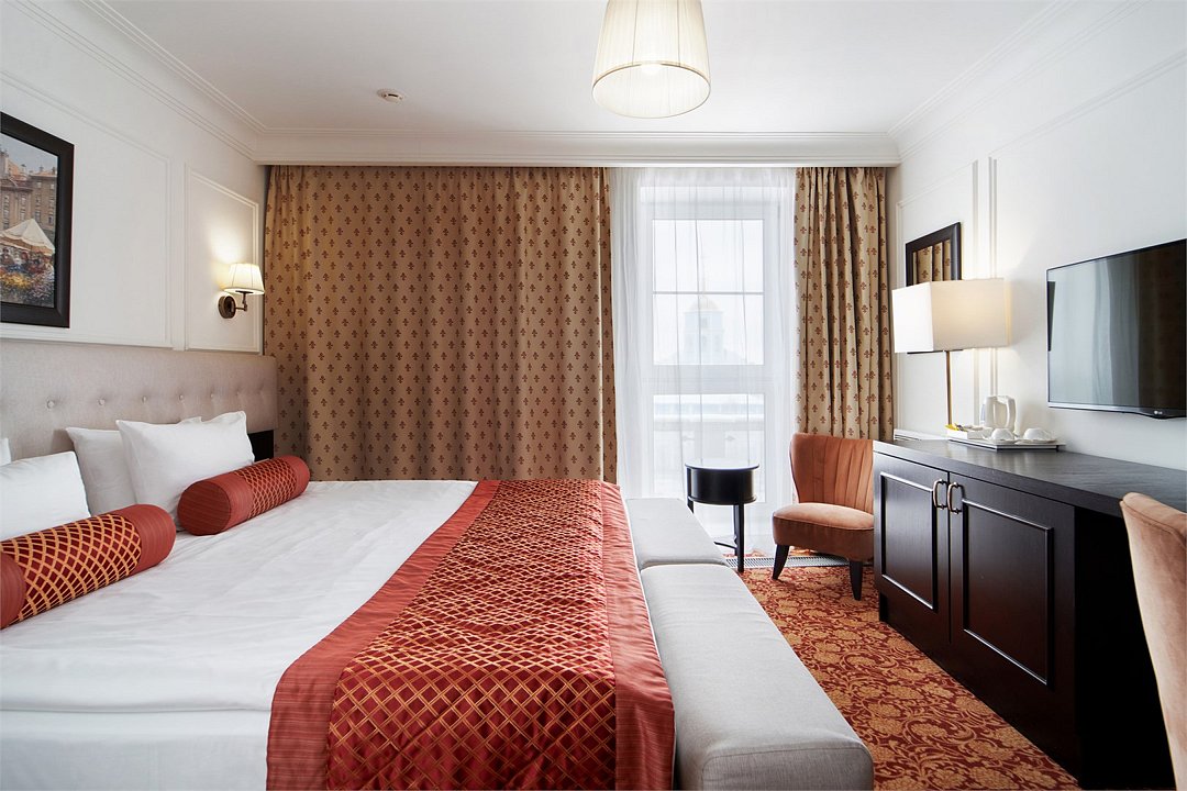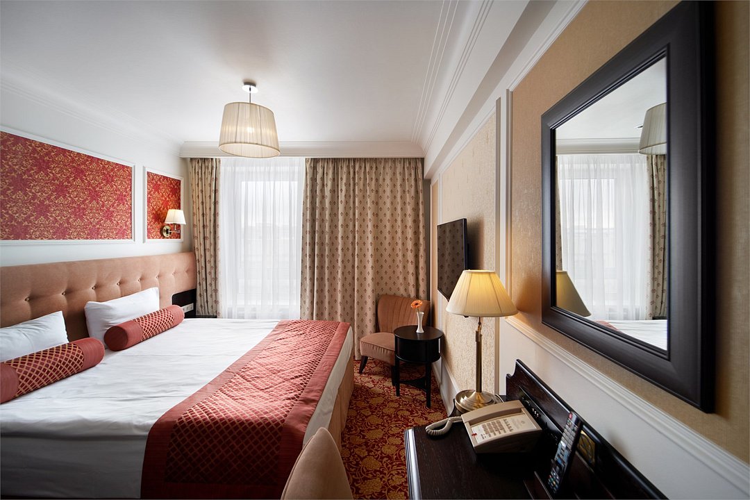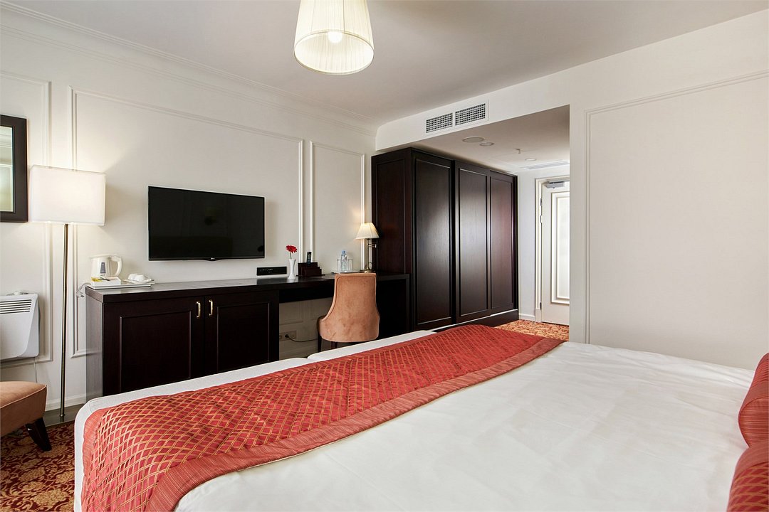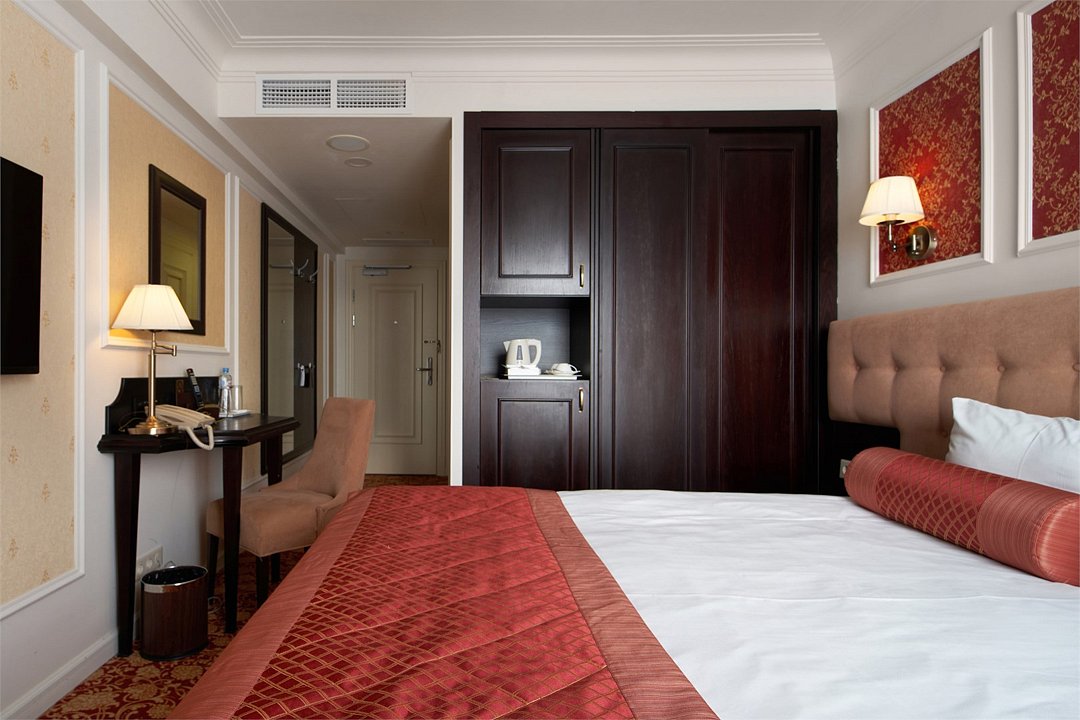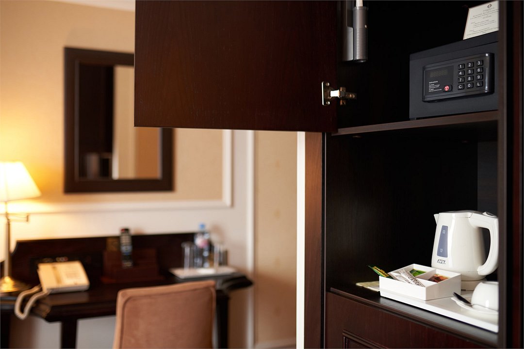 телевизор, Wi-Fi, телефон, холодильник, кондиционер, настольные лампы, фен, электронные замки, душевая кабина, халаты, банные полотенца, тапочки, косметические средства, две односпальные или большая двуспальная кровать, ортопедический матрас, кресла, стулья, шкаф для одежды, письменный стол, багажная тумба, звуконепроницаемые стены и окна, мини-бар, письменные принадлежности, чайный набор, обслуживание номеров, информационная карта, меню, сейф, чайник, косметическое зеркало, питьевая вода, ковровое покрытие, вид на городВ гостиничном номере