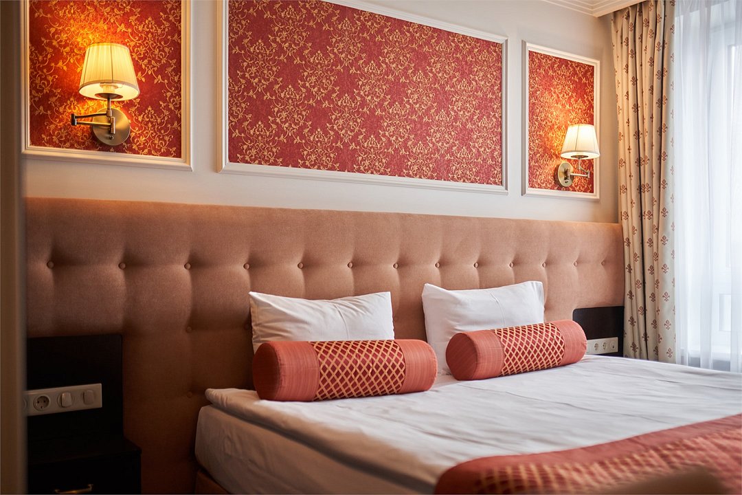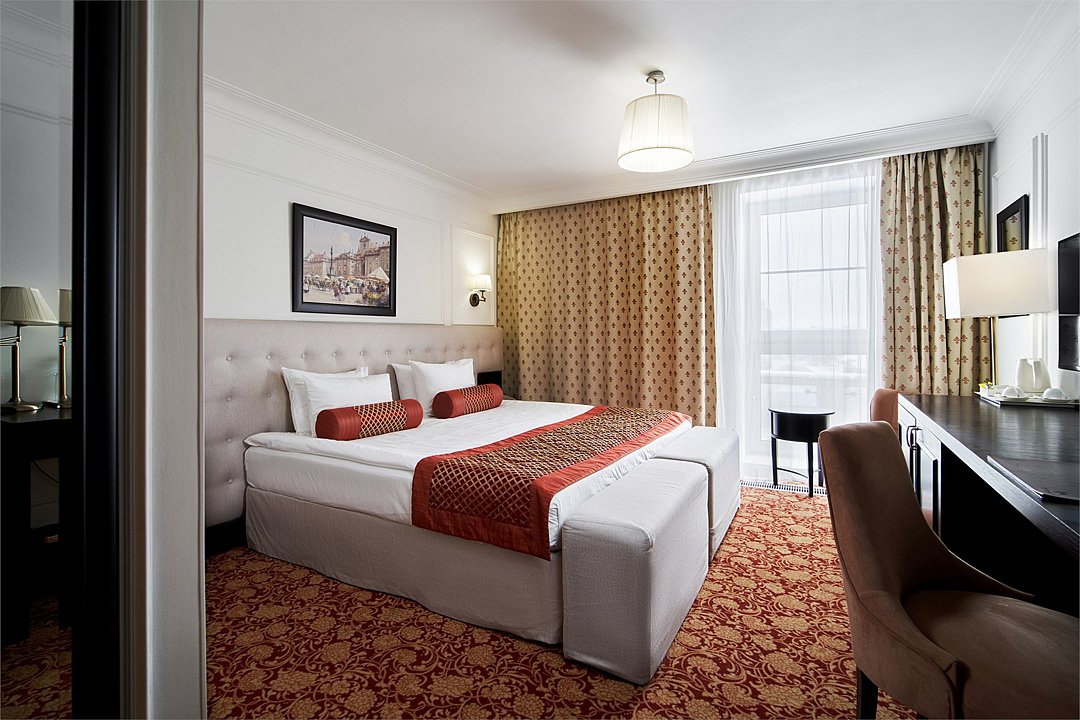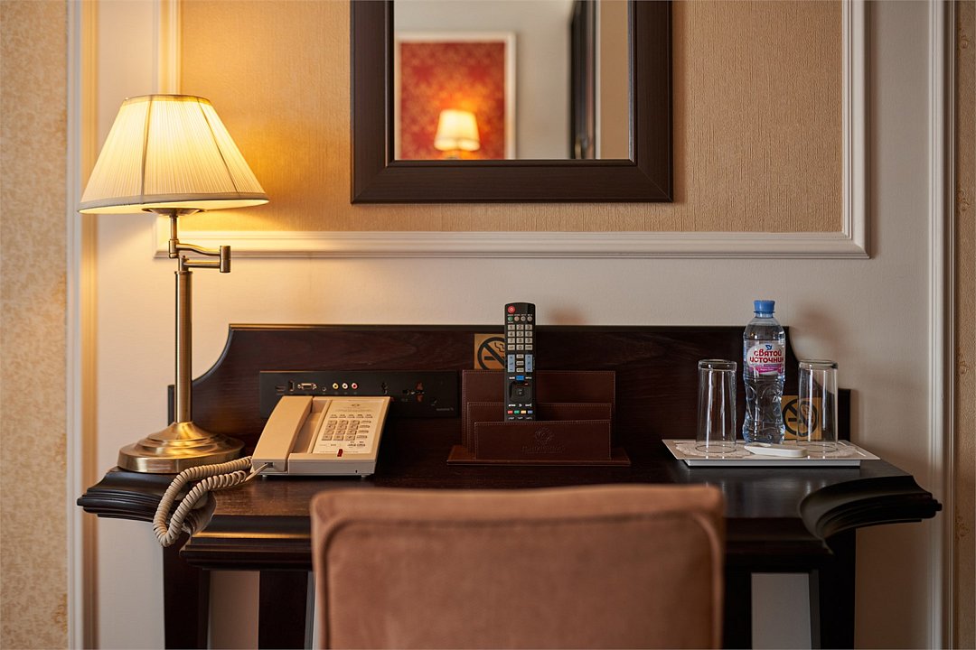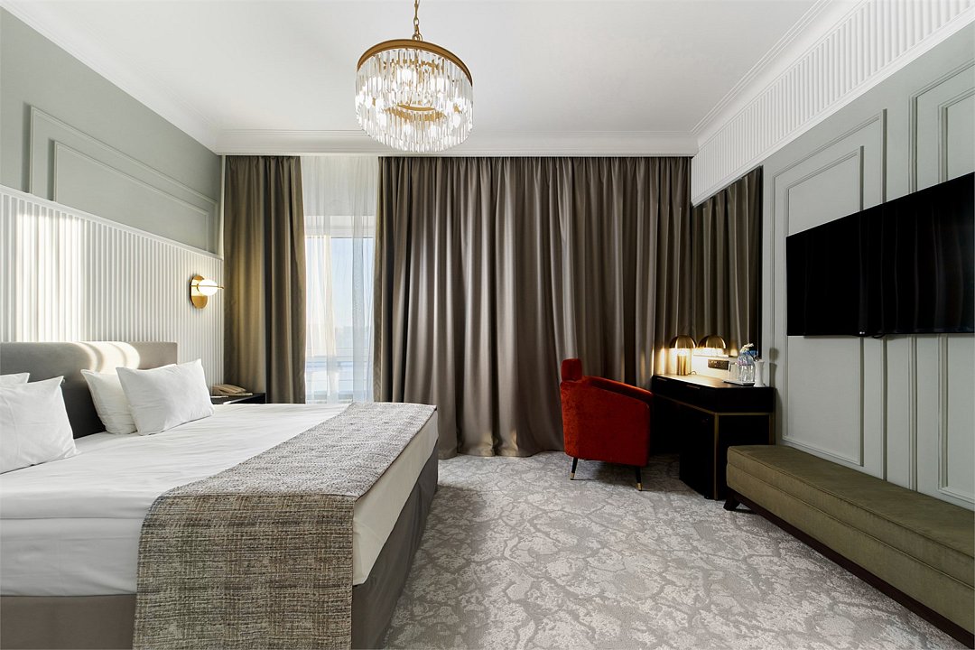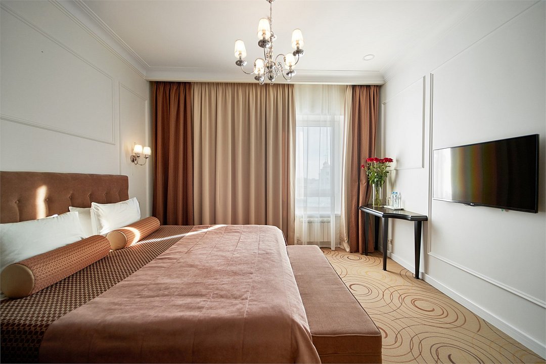 телевизор, Wi-Fi, телефон, холодильник, кондиционер, настольные лампы, фен, электронные замки, душевая кабина, халаты, банные полотенца, тапочки, косметические средства, две односпальные или большая двуспальная кровать, ортопедический матрас, кресла, стулья, шкаф для одежды, письменный стол, багажная тумба, звуконепроницаемые стены и окна, мини-бар, письменные принадлежности, чайный набор, обслуживание номеров, информационная карта, меню, сейф, чайник, косметическое зеркало, питьевая вода, ковровое покрытие, вид на городВ гостиничном номере