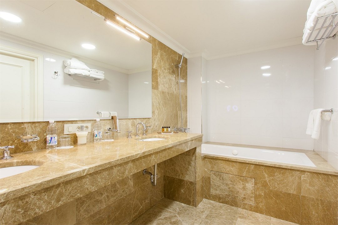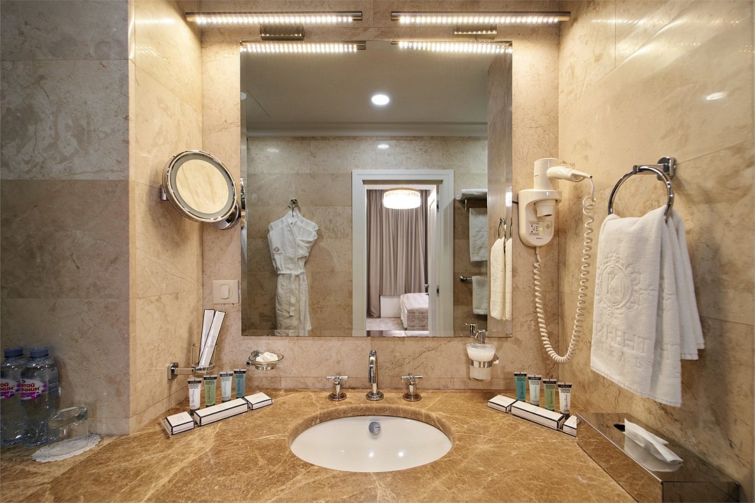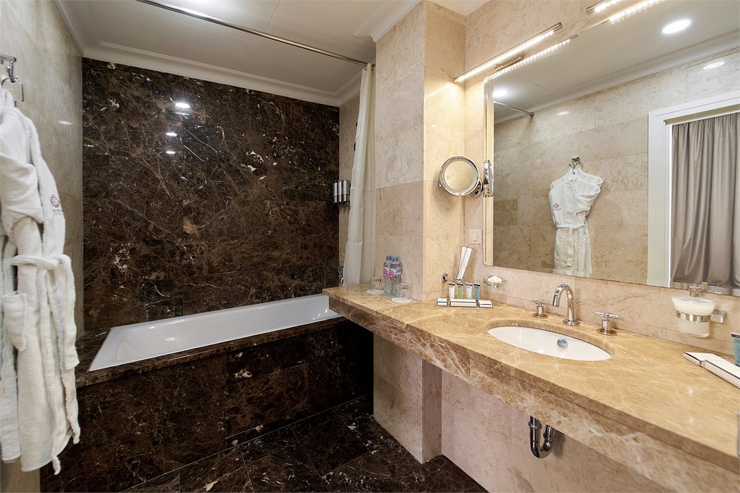 «Бизнес» — однокомнатный номер общей площадью 25 м² с широкой кроватью 200 см или двумя отдельными кроватями 100 см и прикроватными тумбочками. В каждом номере удобный косметический столик с зеркалом и большой платяной шкаф для одежды. Ванная комната, отделанная мрамором, и душевая кабина с тропическим душем. Звукоизолирующие окна со шторами black-out не позволят нарушить ваш безмятежный сон.Услуги и удобства