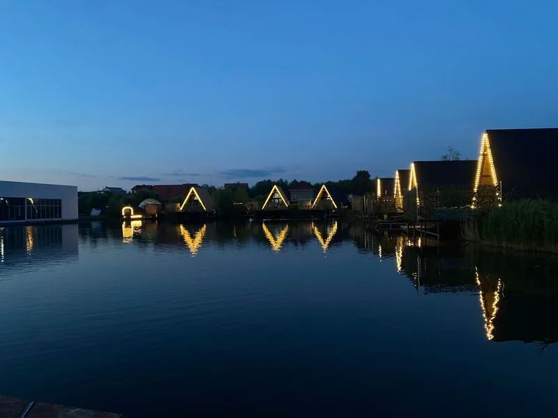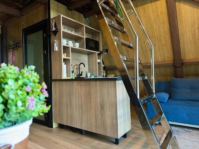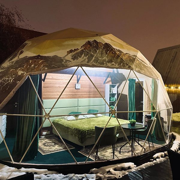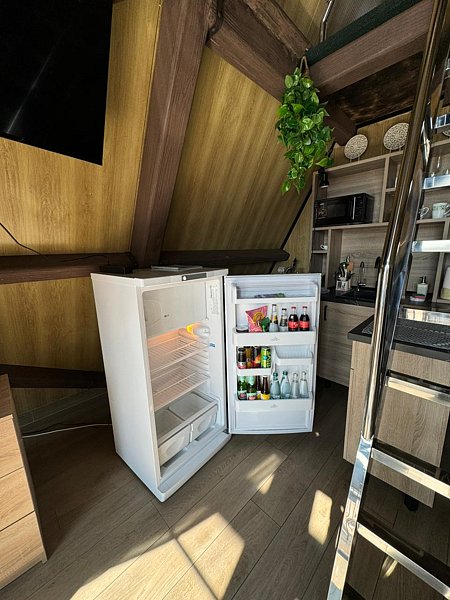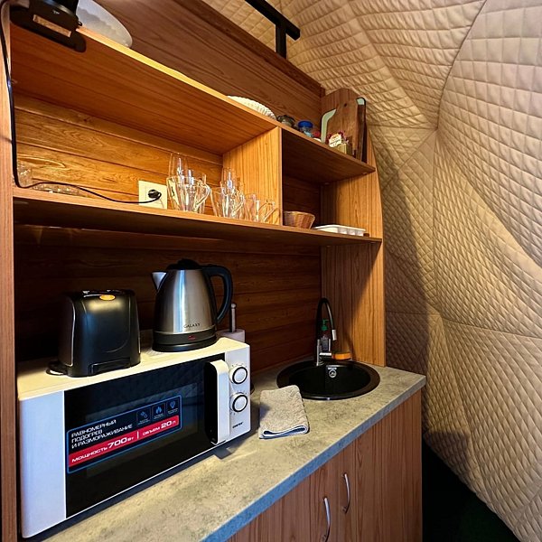 В каждом домике А-Фрейм предусмотрено все для удобства: спальные места со свежим постельный бельём, холодильник, микроволновая печь, чайник, набор посуды и приборов, туалетная комната, полотенца, халаты.
