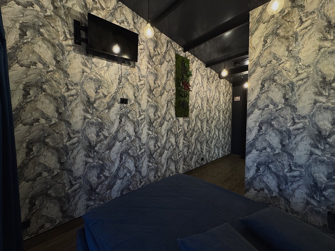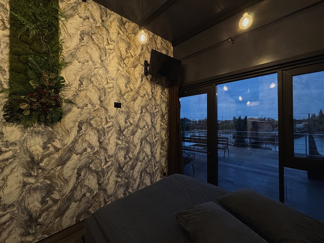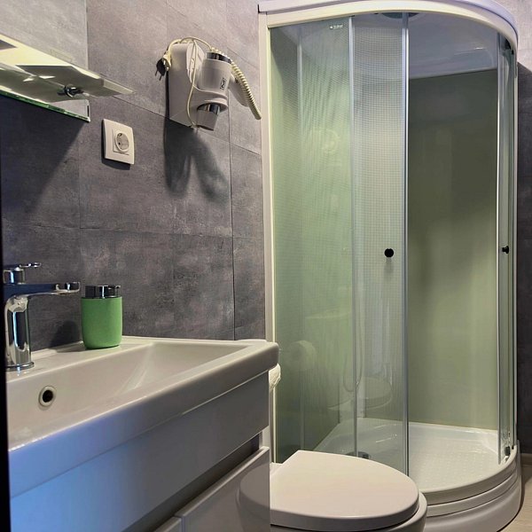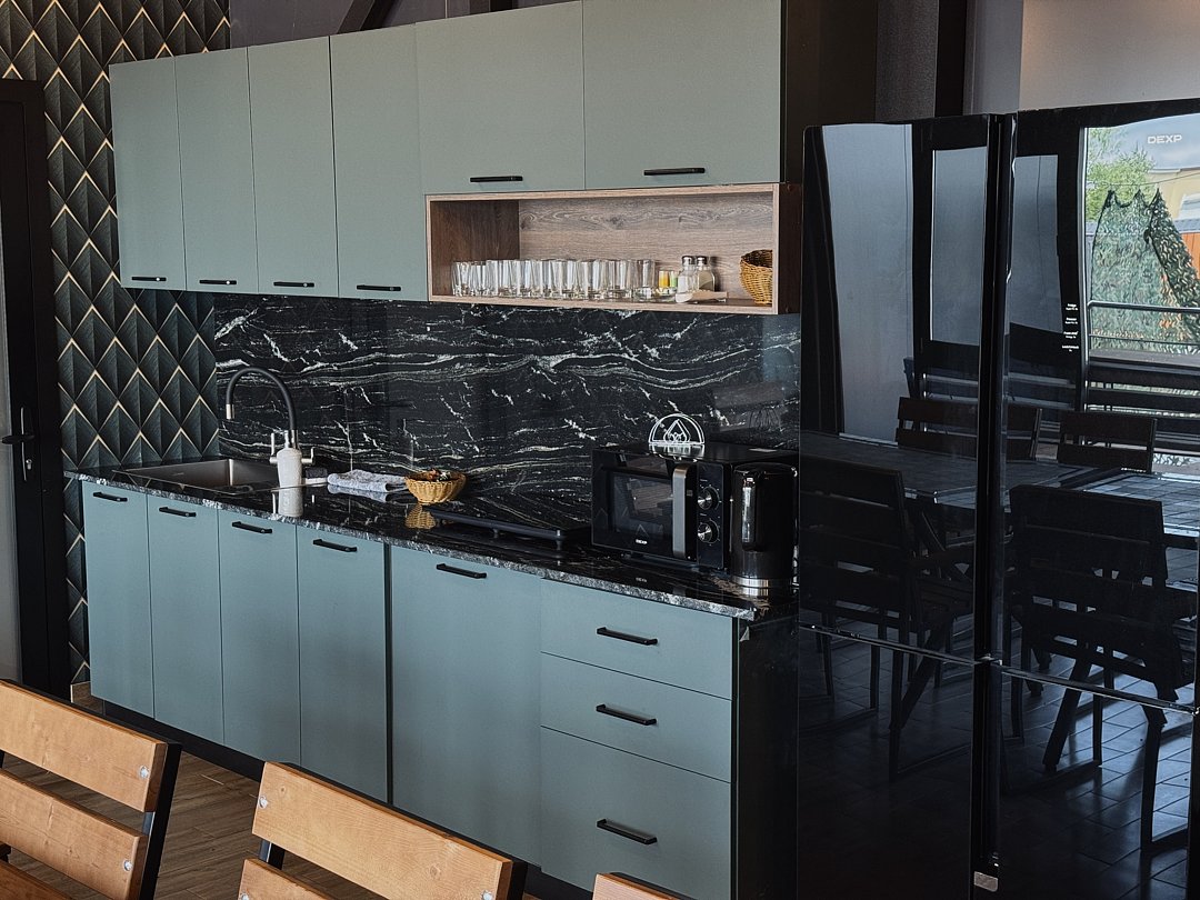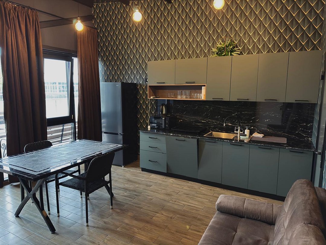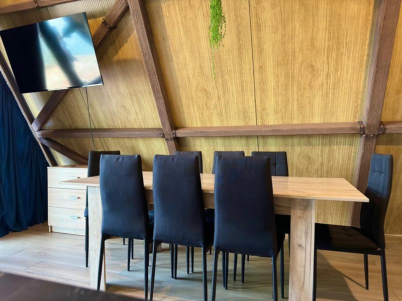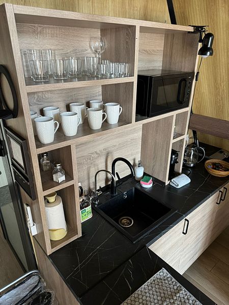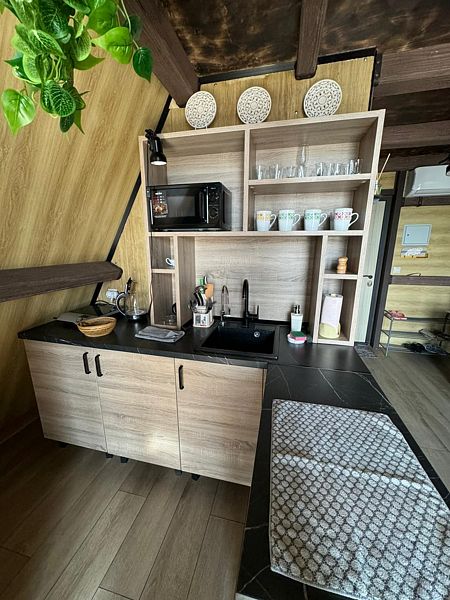 Удобства: кровать двуспальная, стулья, столик, телевизор, душевая кабина, туалет в каждом номере отдельно, своя кухня, микроволновка, чайник, столовые приборы, индукционная плита, холодильник.