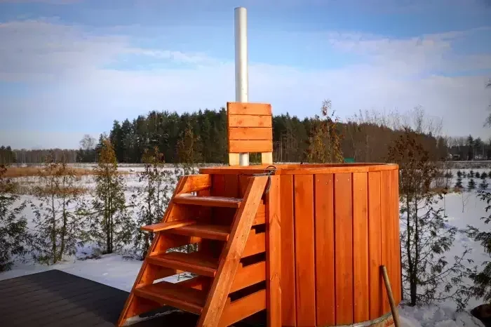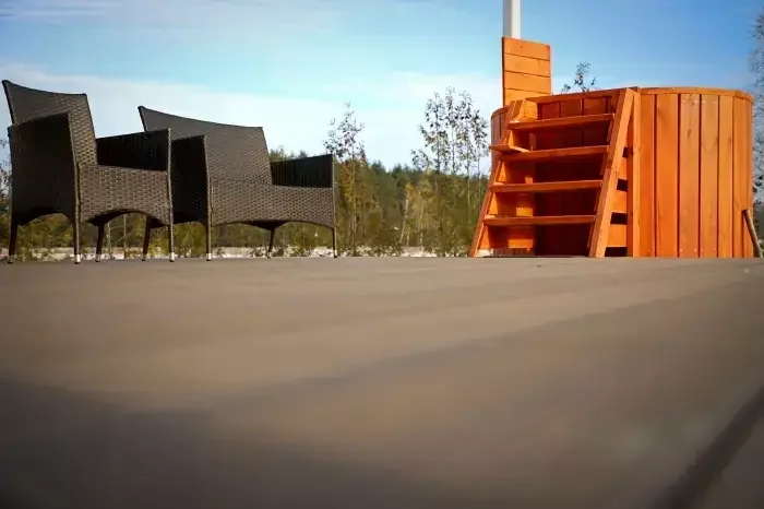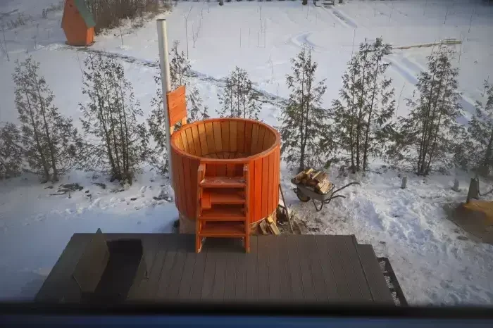 Чан на дровах на террасе, вместимостью до 8 человек и великолепным видом.