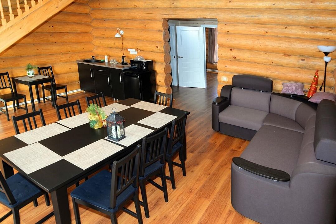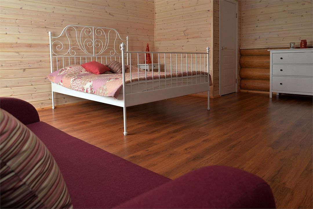 На первом этаже располагаются: одна комната с 1,5-спальной кроватью и раскладным диваном, и гостиная с ещё одним диваном.