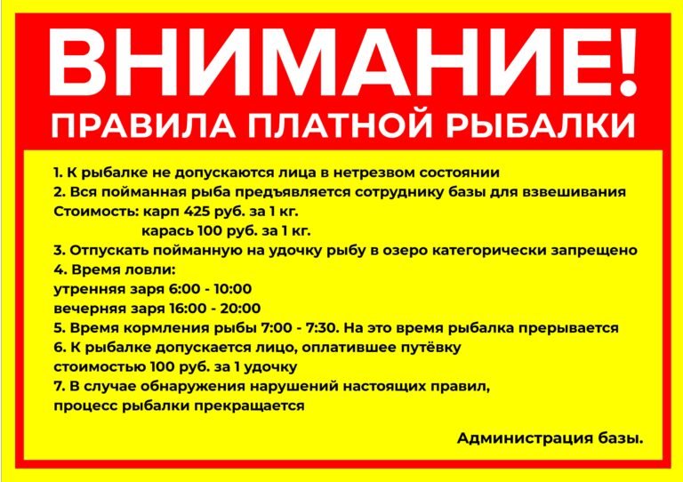 РыбалкаОписаниеЛукоморье — это еще и отличный выбор для любителей рыбалки. Утренняя зорька (с 6:00 до 10:00) — 100 ₽ за удочку (стоимость путевки) + стоимость рыбы. Вечерняя зорька (с 16:00 до 20:00) — 100 ₽ за удочку (стоимость путевки) + стоимость рыбы. Стоимость улова: - карп — 425 ₽/кг;