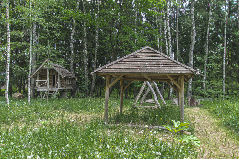 Коттедж включает в себя прихожую, кухню-гостиную, три спальни, душевую, туалет и балкон. На дворовой территории: стол с двумя скамейками и мангальная зона.