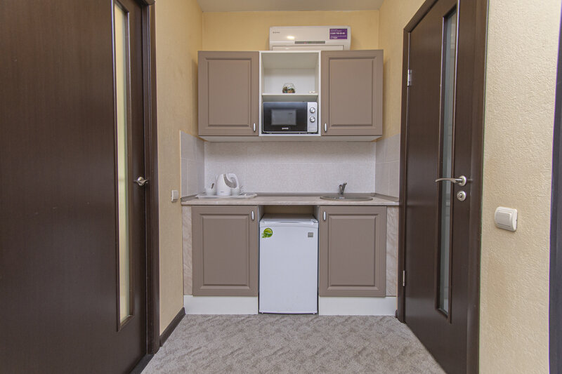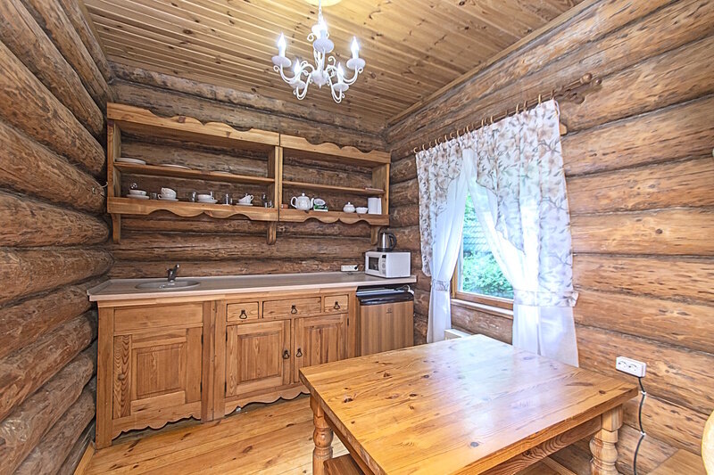 Чтобы гости могли самостоятельно готовить любимые блюда, дома оборудованы кухней с необходимой бытовой техникой. А именно индукционной плитой, холодильником, чайником, микроволновой печью.