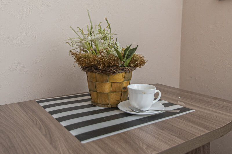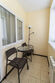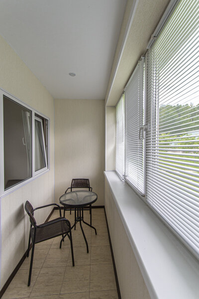 Индукционная плита, балкон с зоной для отдыха. На балконе — стол и два стула, напольный светильник, на окнах москитная сетка.