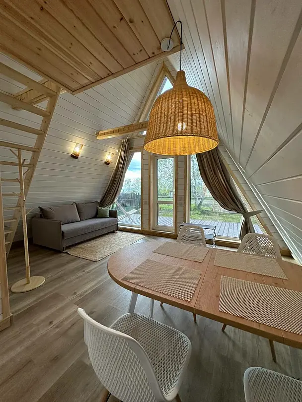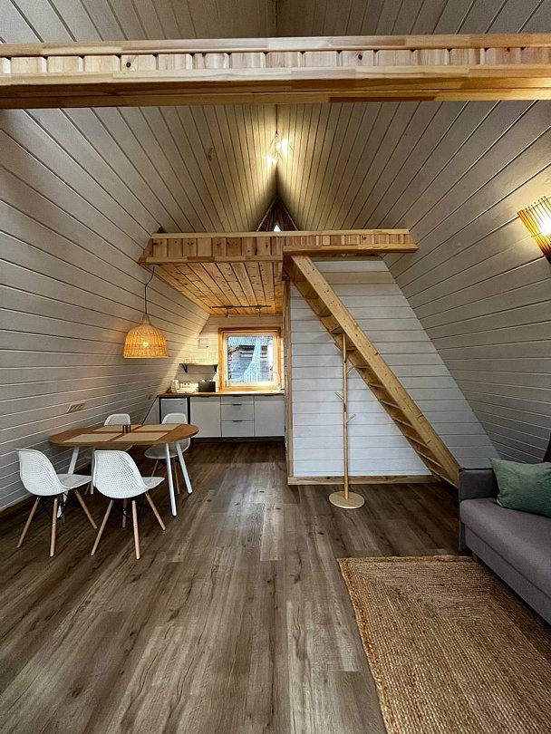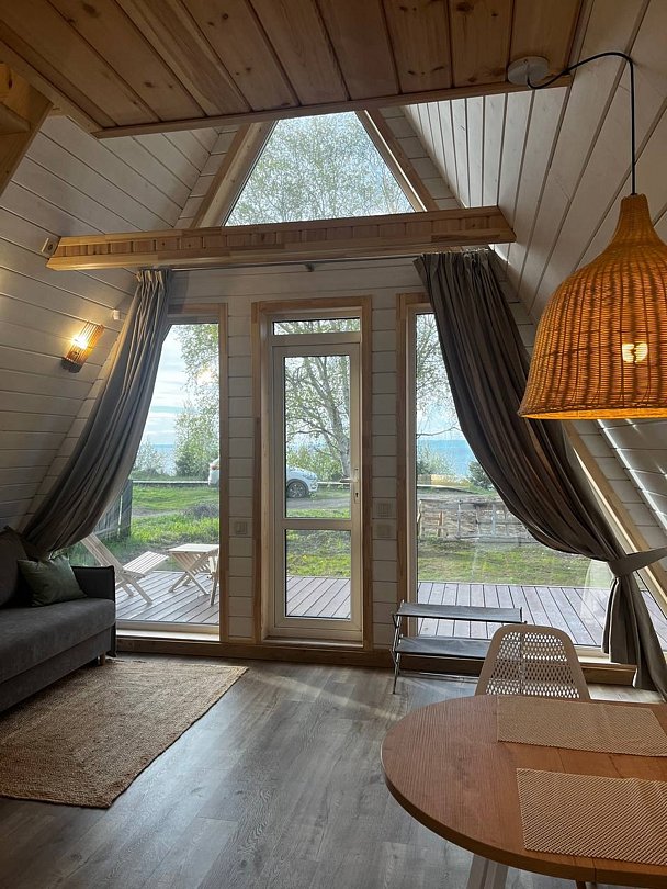 Внутри: оборудованная кухня с обеденной зоной, стильный санузел, на втором этаже — комфортная двуспальная кровать. Из домика открывается вид на озеро Байкал, рядом с территорией проходит экологическая тропа Байкальского заповедника!