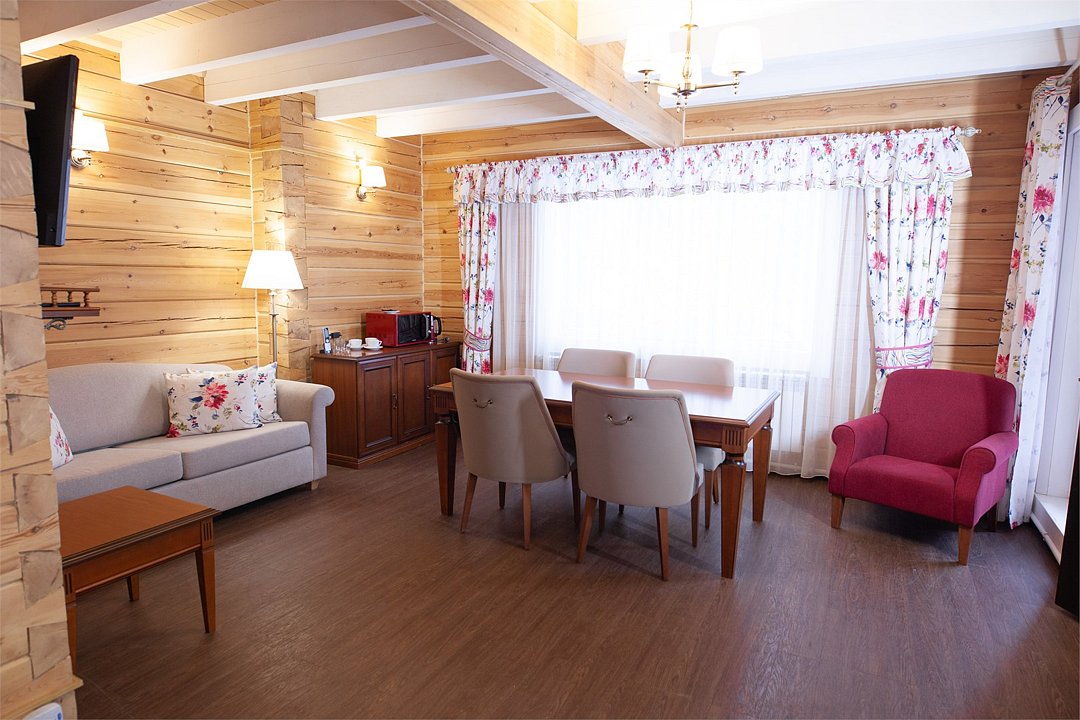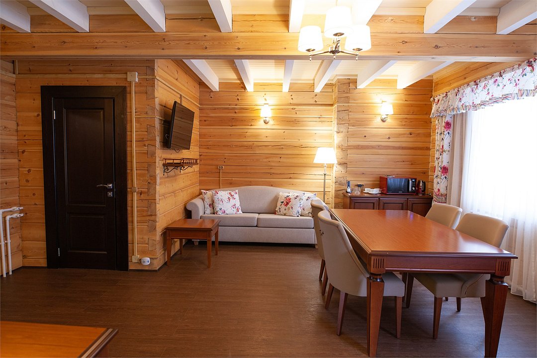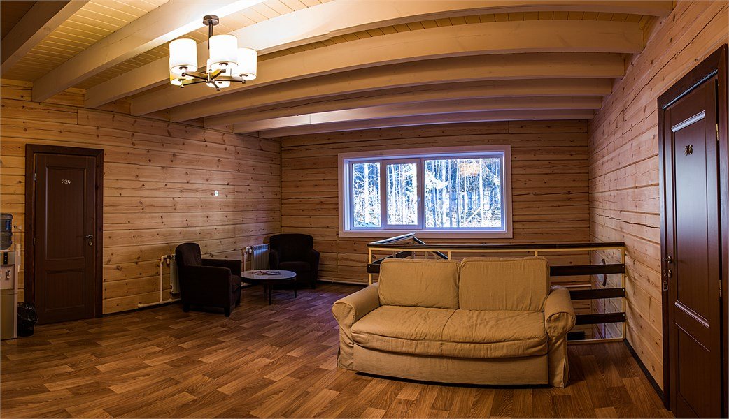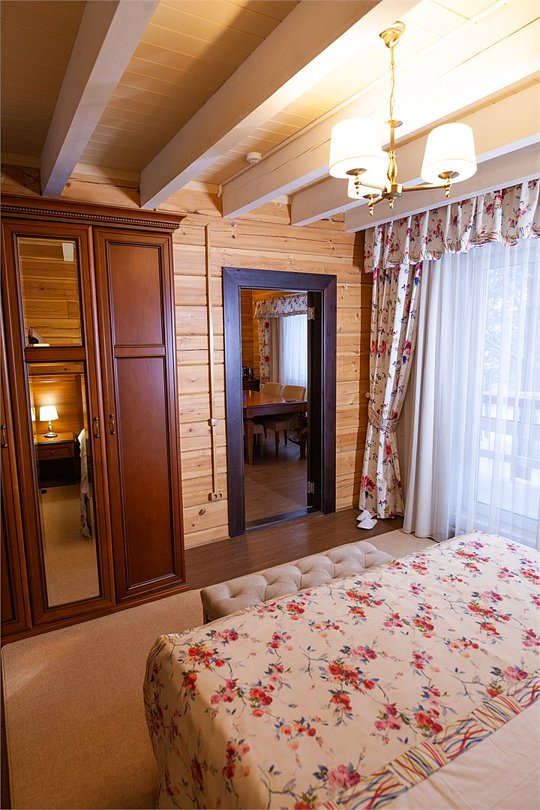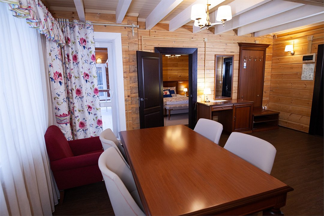 Просторные и светлые двухкомнатные номера с балконом категории «апартаменты» идеально подходят для комфортного отдыха семьей и для длительного проживания. Номера выполнены в сибирском стиле в теплых тонах из натуральных материалов. В спальне – одна большая семейная кровать и ванная комната с душевой кабиной, в гостиной – обеденная зона на 6 персон с мини-холодильником, мультиваркой или микроволновой печью, раскладной диван, гостевой санузел. Продуманный до мелочей интерьер, таежный аромат натурального дерева, уютная атмосфера для ценителей комфортного загородного отдыха высшего класса. Номера расположены в новых двухэтажных корпусах без лифта. Количество номеров - 4.Услуги и удобства