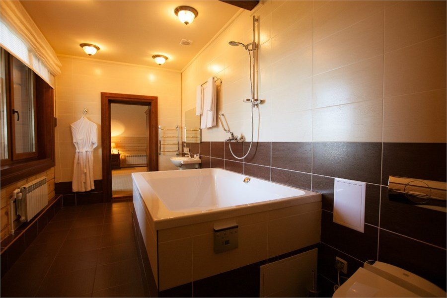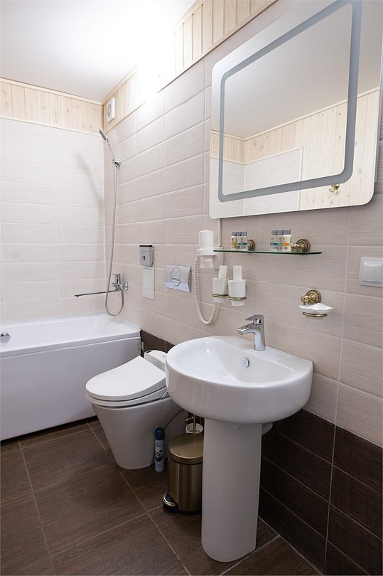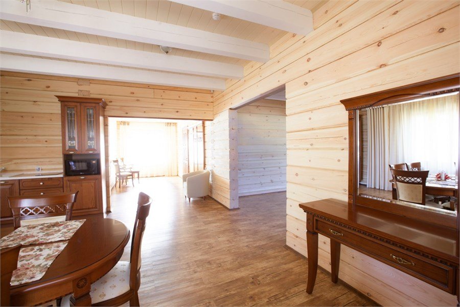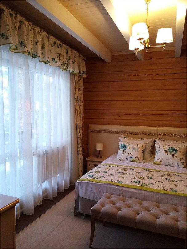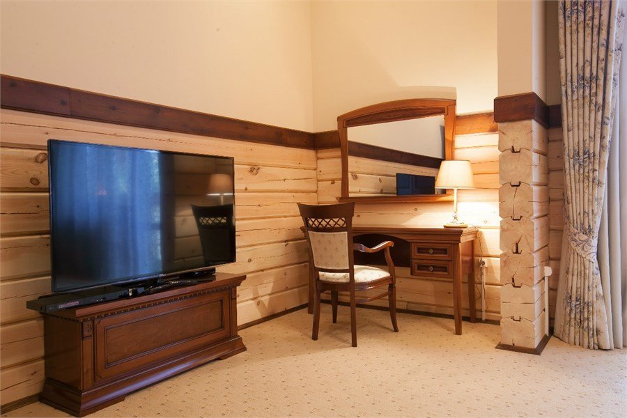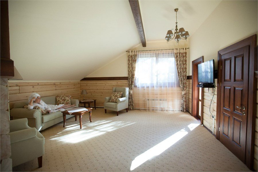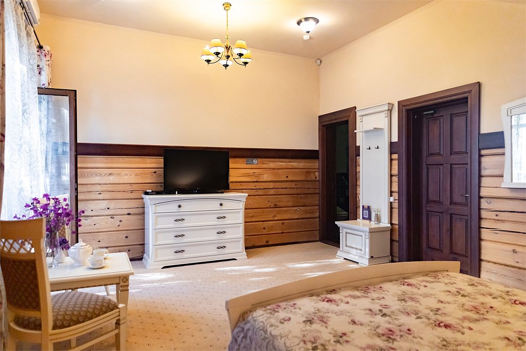 Просторные и светлые двухкомнатные номера с балконом категории «апартаменты» идеально подходят для комфортного отдыха семьей и для длительного проживания. Номера выполнены в сибирском стиле в теплых тонах из натуральных материалов. В спальне – одна большая семейная кровать и ванная комната с душевой кабиной, в гостиной – обеденная зона на 6 персон с мини-холодильником, мультиваркой или микроволновой печью, раскладной диван, гостевой санузел. Продуманный до мелочей интерьер, таежный аромат натурального дерева, уютная атмосфера для ценителей комфортного загородного отдыха высшего класса. Номера расположены в новых двухэтажных корпусах без лифта. Количество номеров - 4.Услуги и удобства