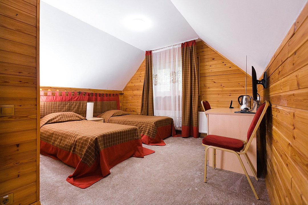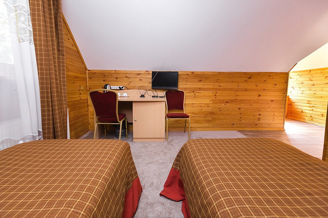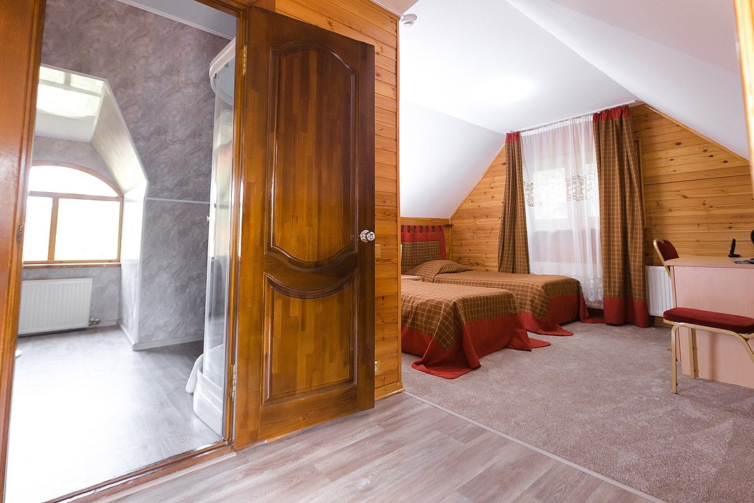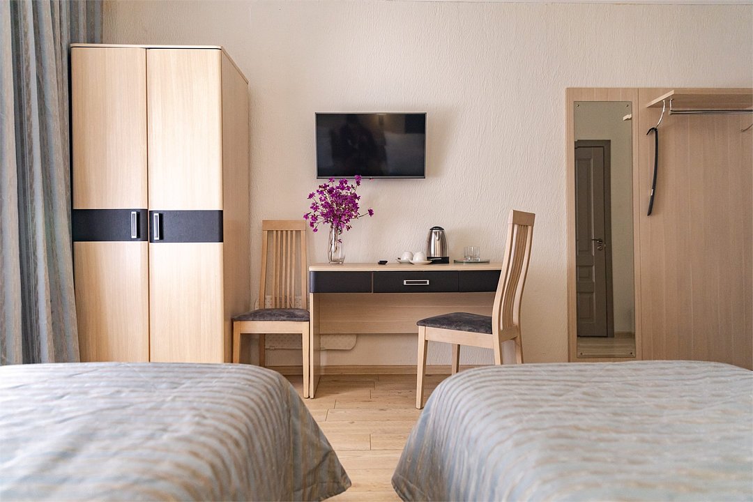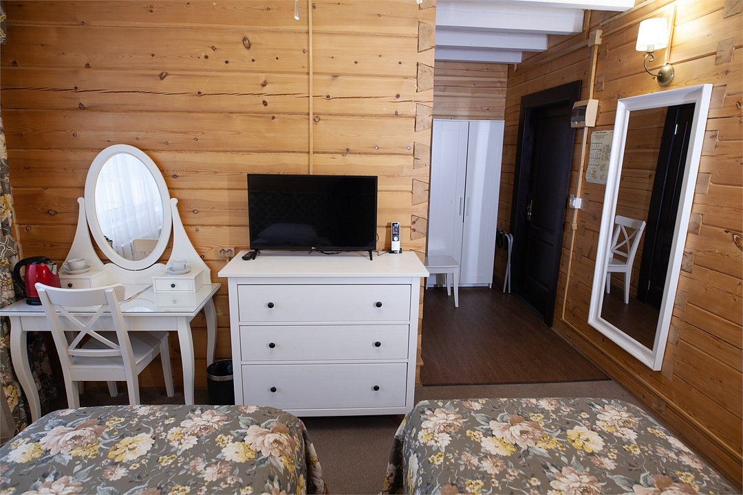 телевизор, кабельное телевидение, Wi-Fi, фен, душевая кабина, санузел, водонагреватель, банные принадлежности, гигиенические средства, две односпальные кровати, тумбы, стулья, шкаф для одежды, вешалки, зеркало, раковина, отдельный вход в номер, вид во двор, вид на лес, можно с питомцамиВ гостиничном номере