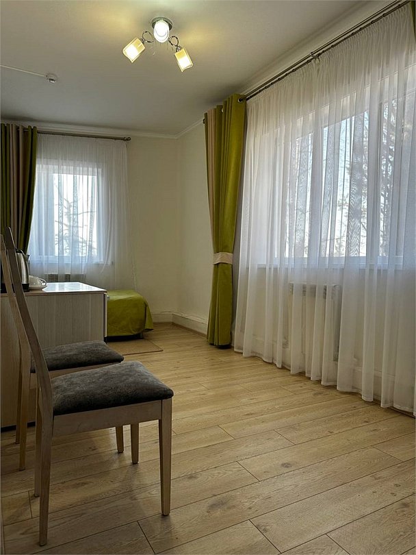 Уютный двухкомнатный номер с балконом после реновации в 2021 году, выполнен в теплых светлых тонах. В спальне – три односпальных кровати. Номер расположен на 2-м этаже двухэтажного деревянного корпуса без лифта. Количество номеров - 1.Услуги и удобства
