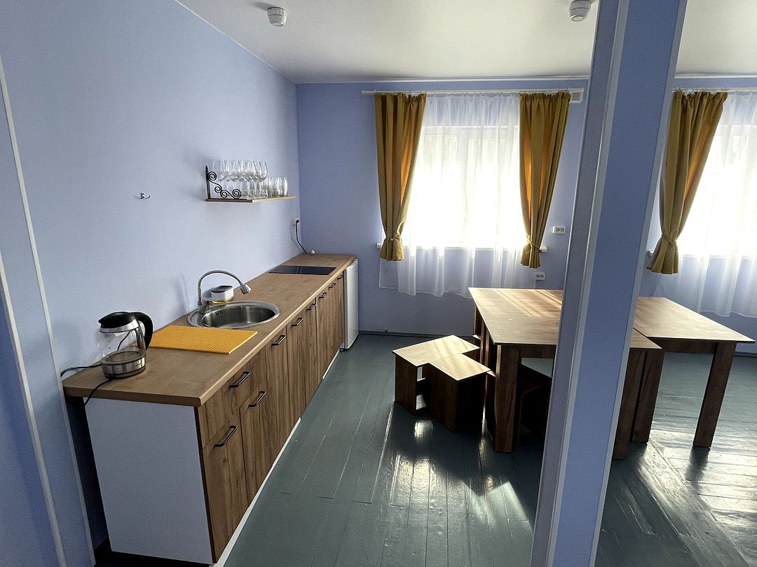 Оснащение номера: смарт-телевизор, холодильник, электрический чайник, варочная панель, кухонная утварь и столовые приборы на 7 персон.