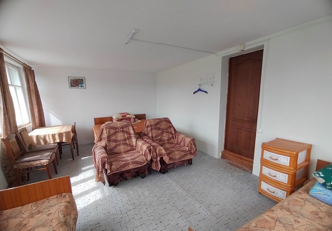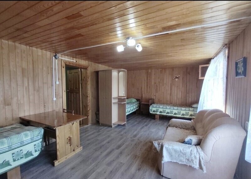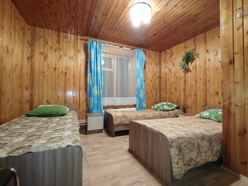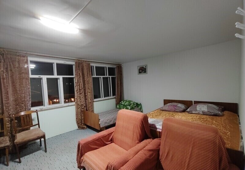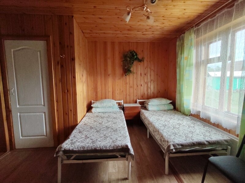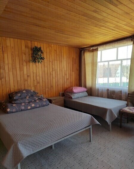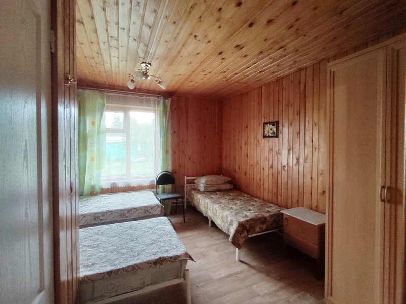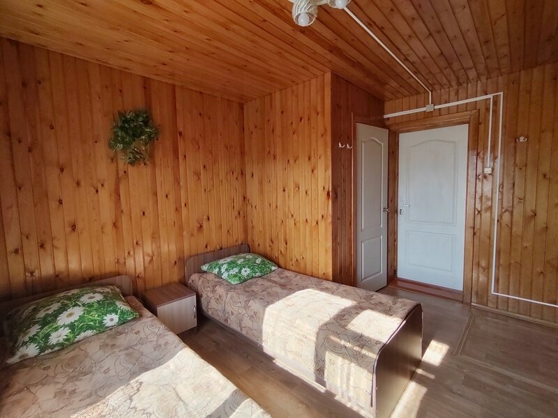 Новые матрасы с подушками. Туалет с раковиной в номере, душ в тёплом помещении отдельно с заднего крыльца. Общая кухня со всем содержимым на этаже.