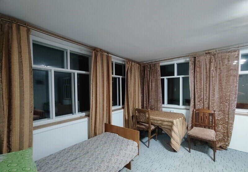 3-х местный номер на 2 этаже, угловой, с панорамными окнами на горы, красивый вид на пик Любви.
