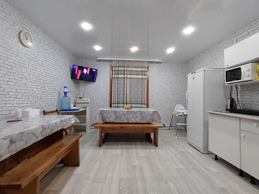 Также есть баня-сауна с душем и с купелью. На территории 5метровый бассейн и сибирский чан. Холодильник и микроволновка на этаже. В номере чайник и посуда. Общая кухня со всем содержимым на 1 этаже.