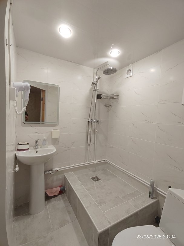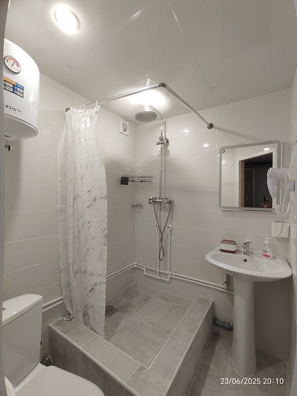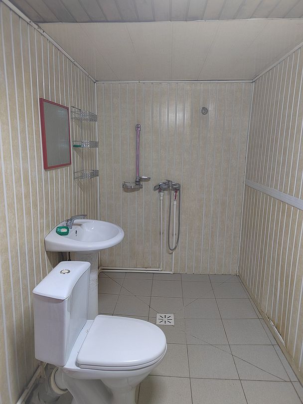 Туалет с раковиной в номере, душ общий, новый.