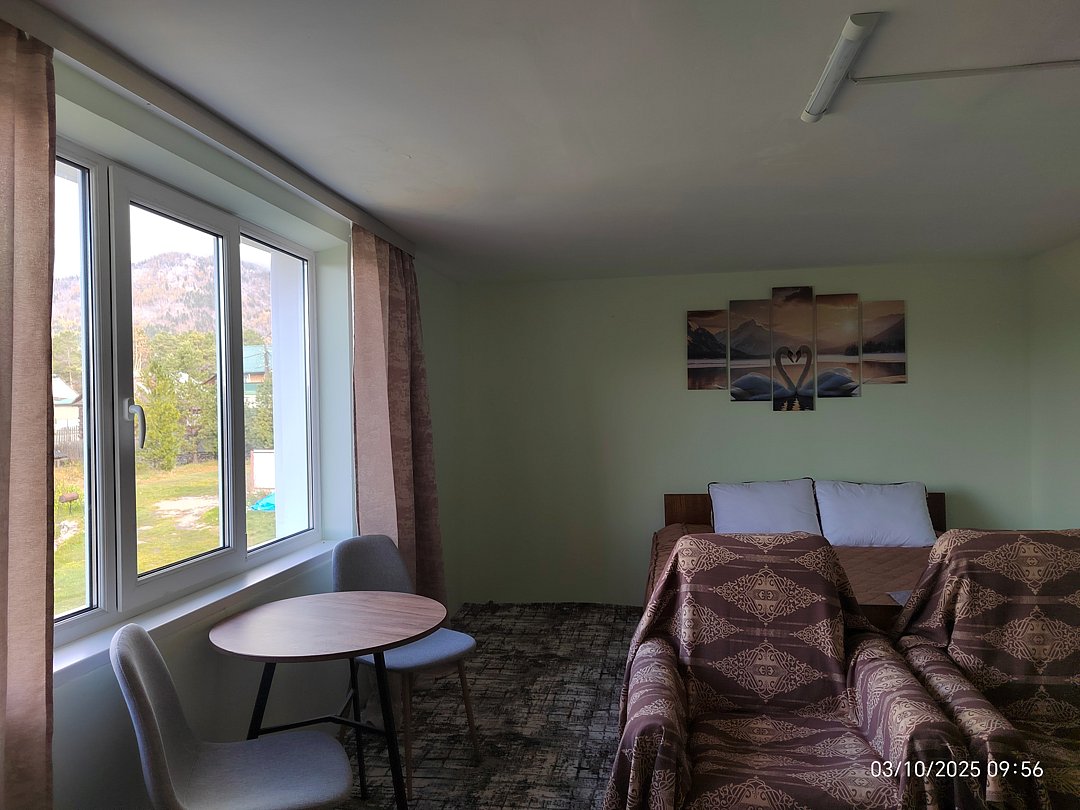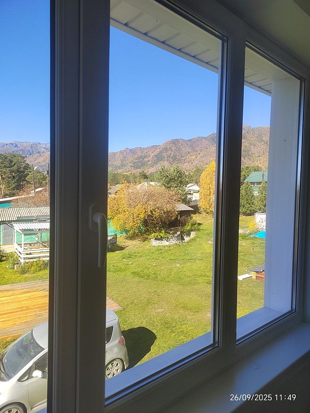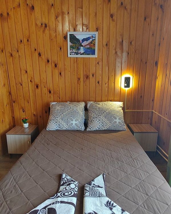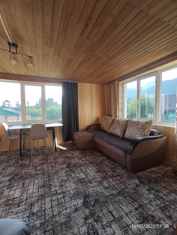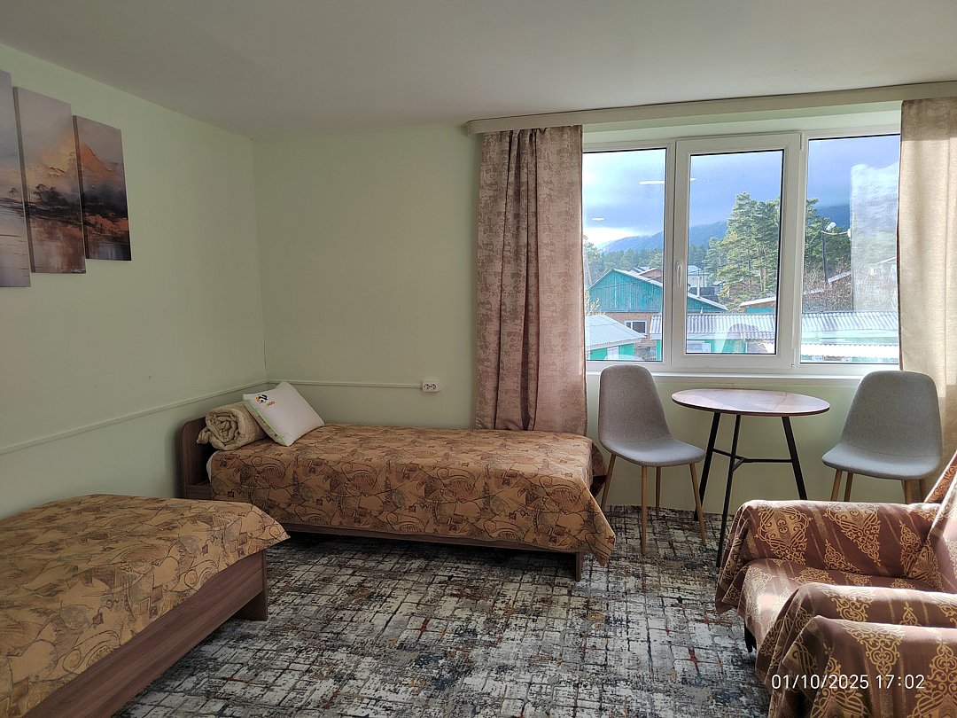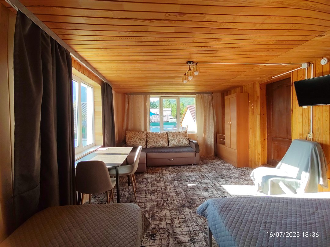 Однокомнатный номер с окном во двор и на горы. На 1-м этаже. Напротив номера — кухня. Туалет в номере, душ общий в тёплом помещении (вход с заднего крыльца). Также есть баня-сауна с санузлом и с купелью. На территории беседки (одна из них с кухонной зоной), качели, 5 метровый бассейн и сибирский чан. Есть мангальная зона с 3 мангалами, в т.ч. новый мангал с грилем. Автопарковка на территории.