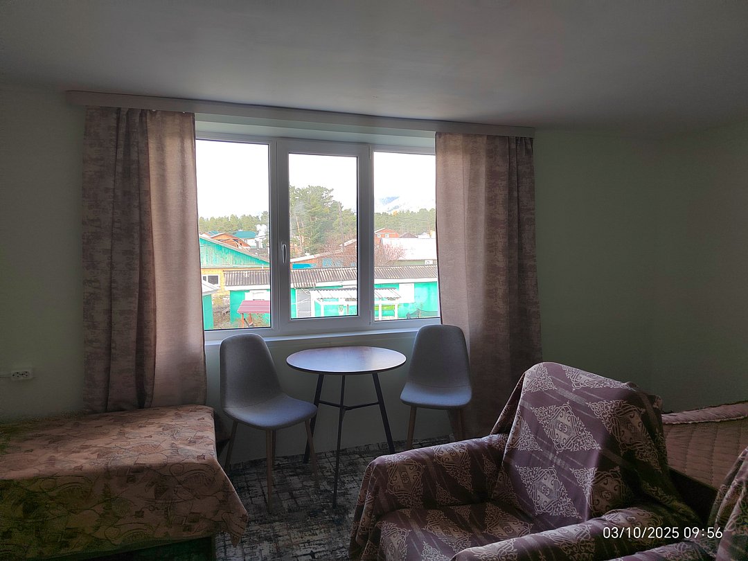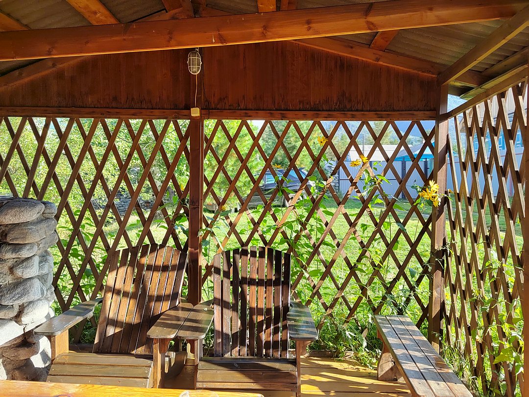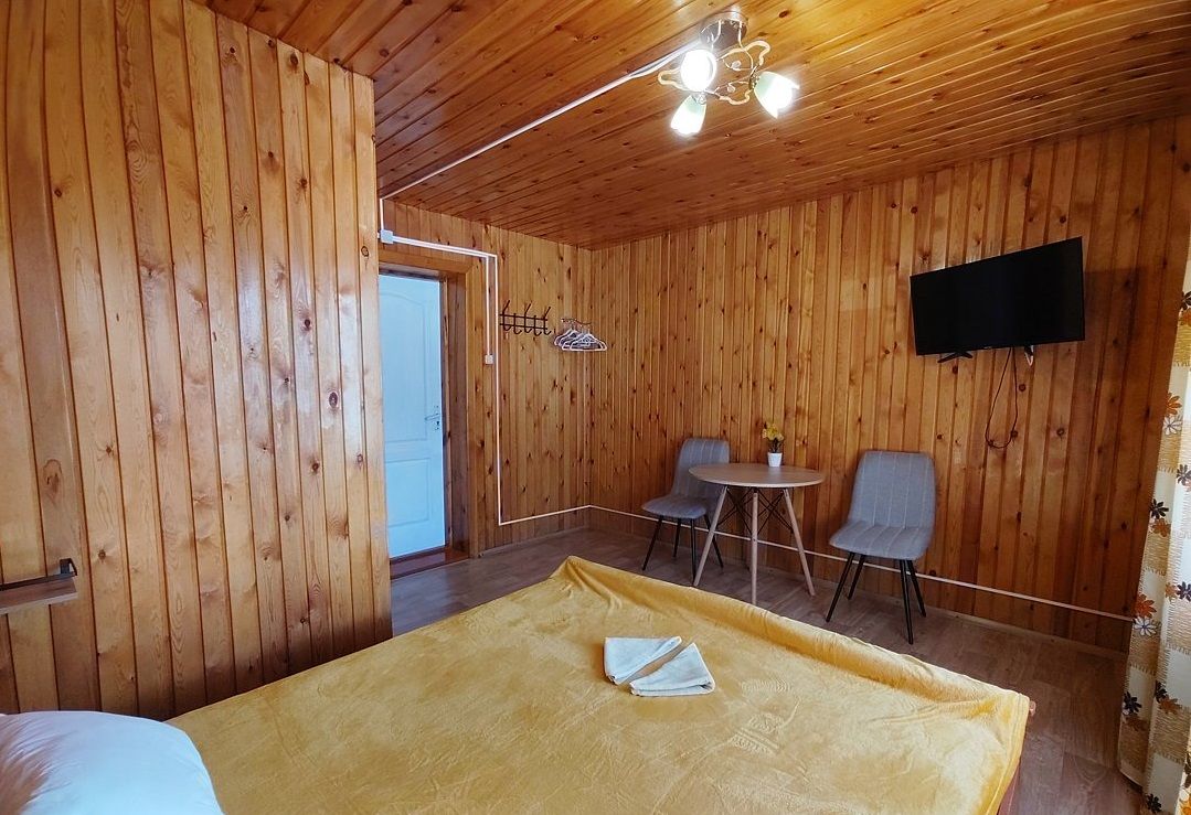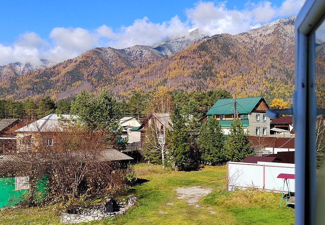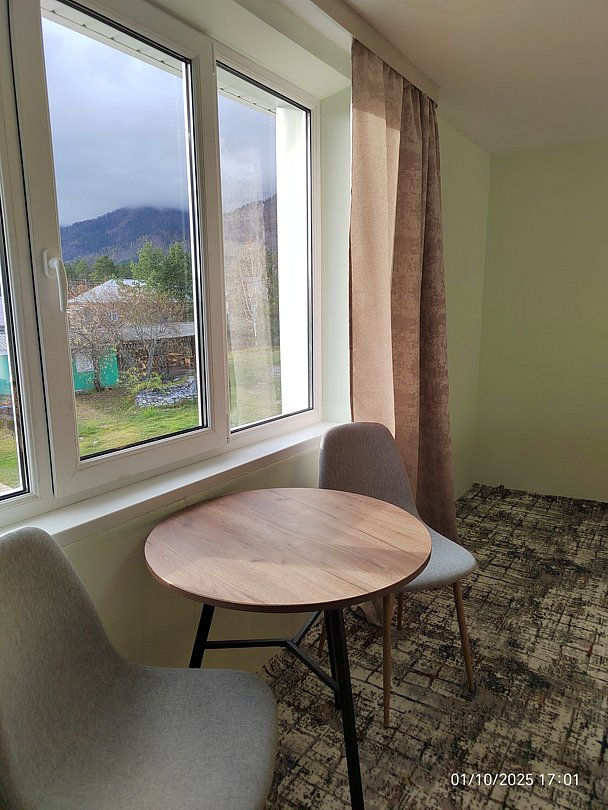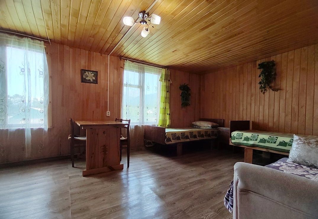 Однокомнатный номер с окном во двор и на горы. На 1-м этаже. Напротив номера — кухня. Туалет в номере, душ общий в тёплом помещении (вход с заднего крыльца). Также есть баня-сауна с санузлом и с купелью. На территории беседки (одна из них с кухонной зоной), качели, 5 метровый бассейн и сибирский чан. Есть мангальная зона с 3 мангалами, в т.ч. новый мангал с грилем. Автопарковка на территории.
