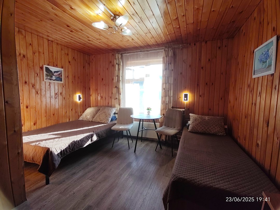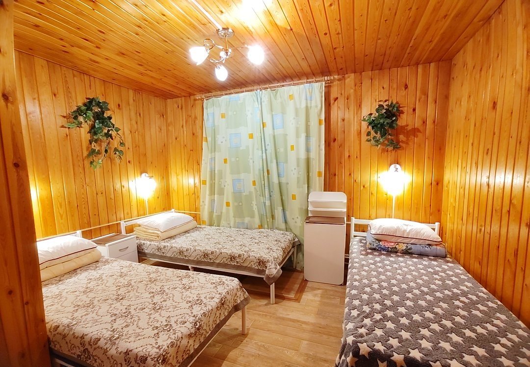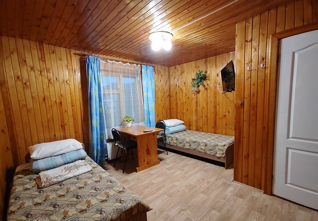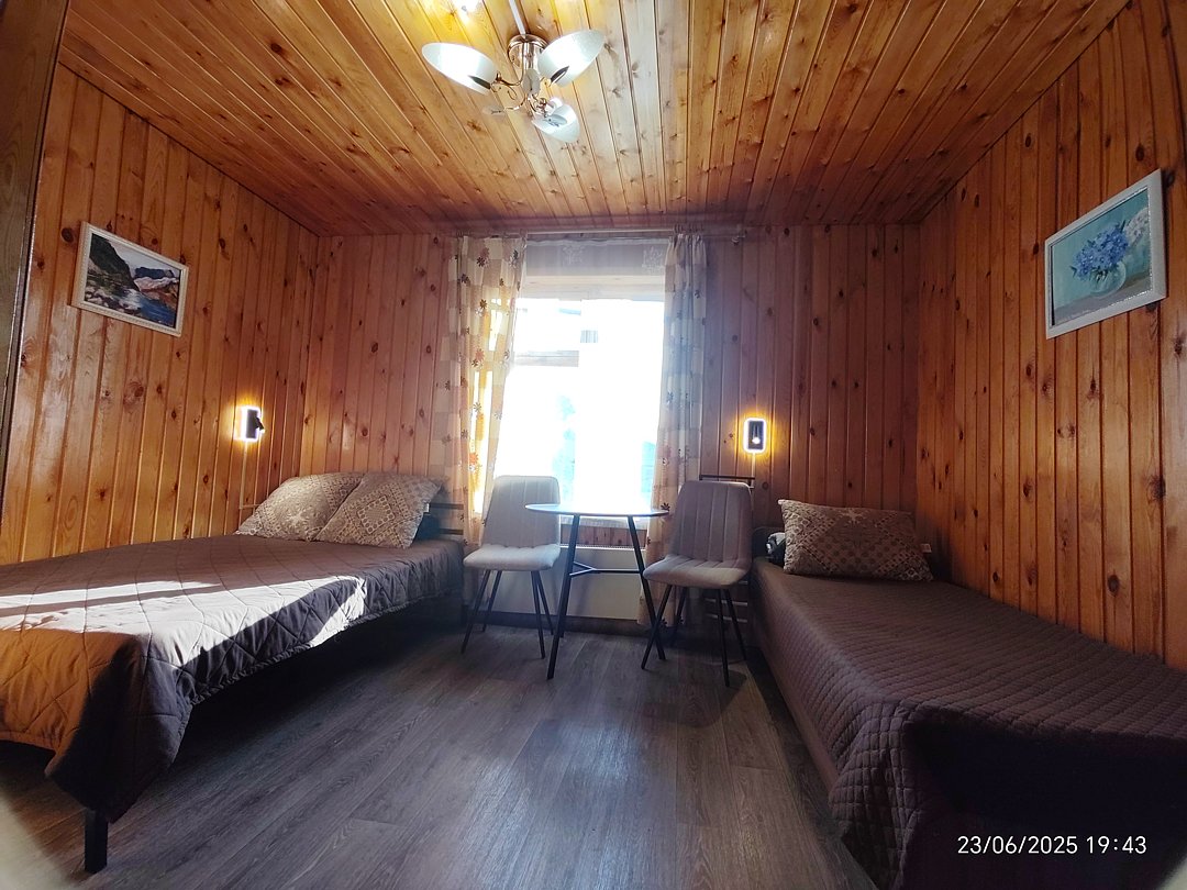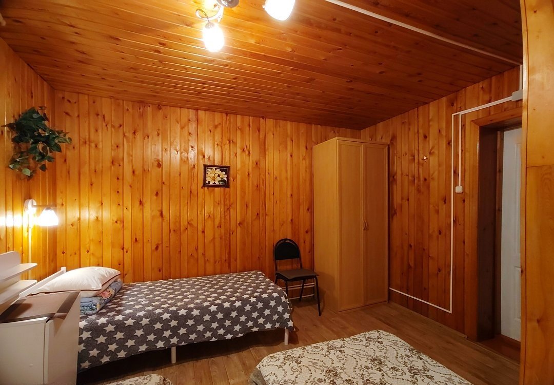 Двух-трёхместный номер на 1-м этаже с одноместной и полутораспальной кроватями. Есть баня-сауна с душем и с купелью. На территории беседки (одна из них с кухонной зоной), 5 метровый бассейн и сибирский чан, также есть мангальная зона с 3 мангалами, в т.ч. новый мангал с грилем. Автопарковка на территории.