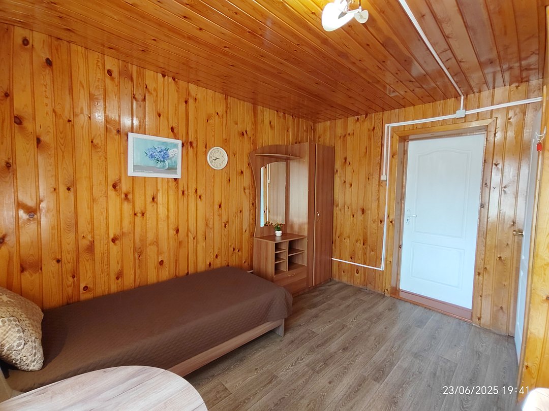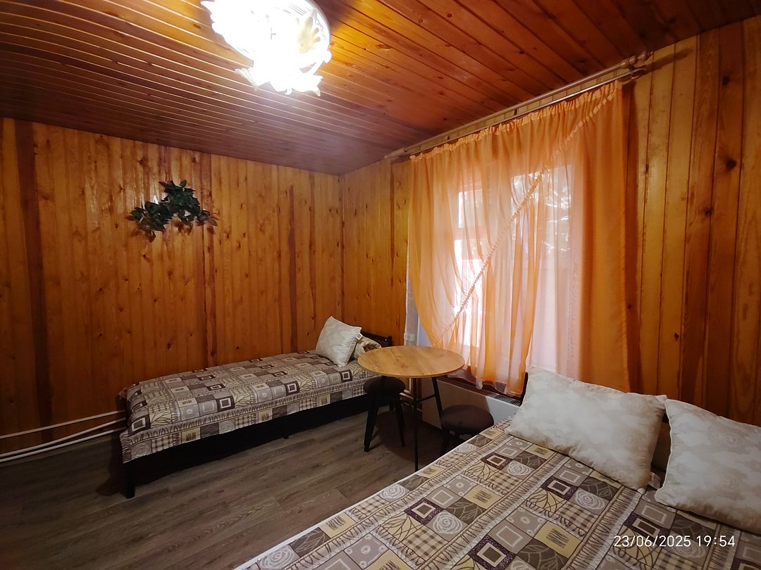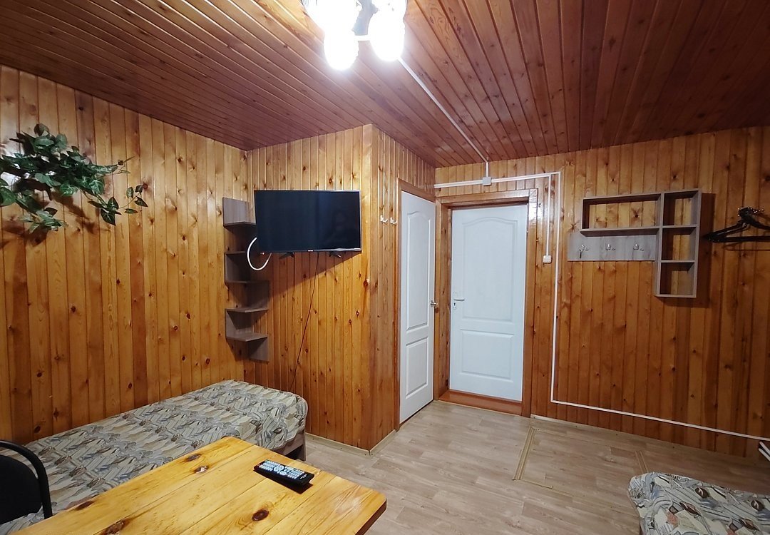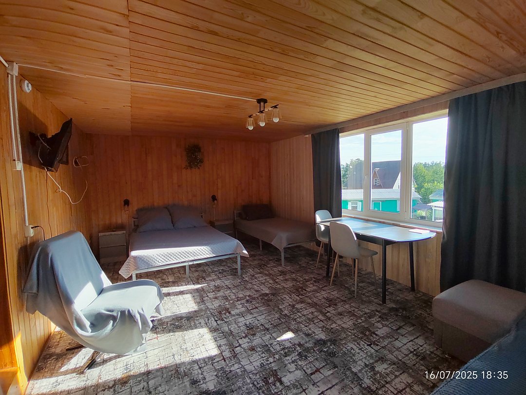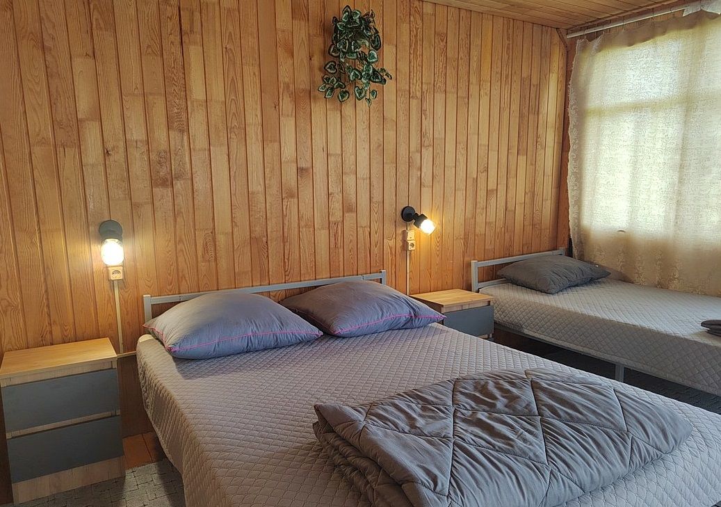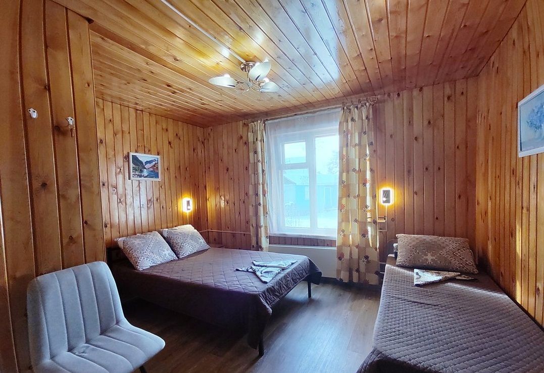 Двух-трёхместный номер на 1-м этаже с одноместной и полутораспальной кроватями. Есть баня-сауна с душем и с купелью. На территории беседки (одна из них с кухонной зоной), 5 метровый бассейн и сибирский чан, также есть мангальная зона с 3 мангалами, в т.ч. новый мангал с грилем. Автопарковка на территории.