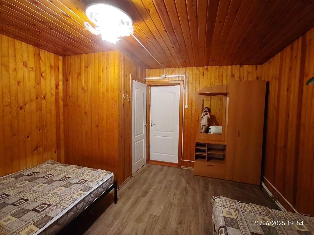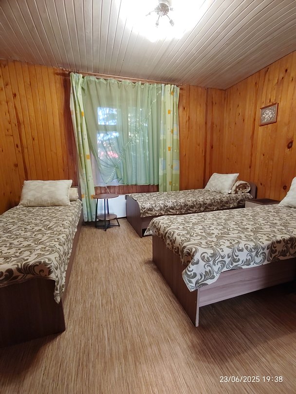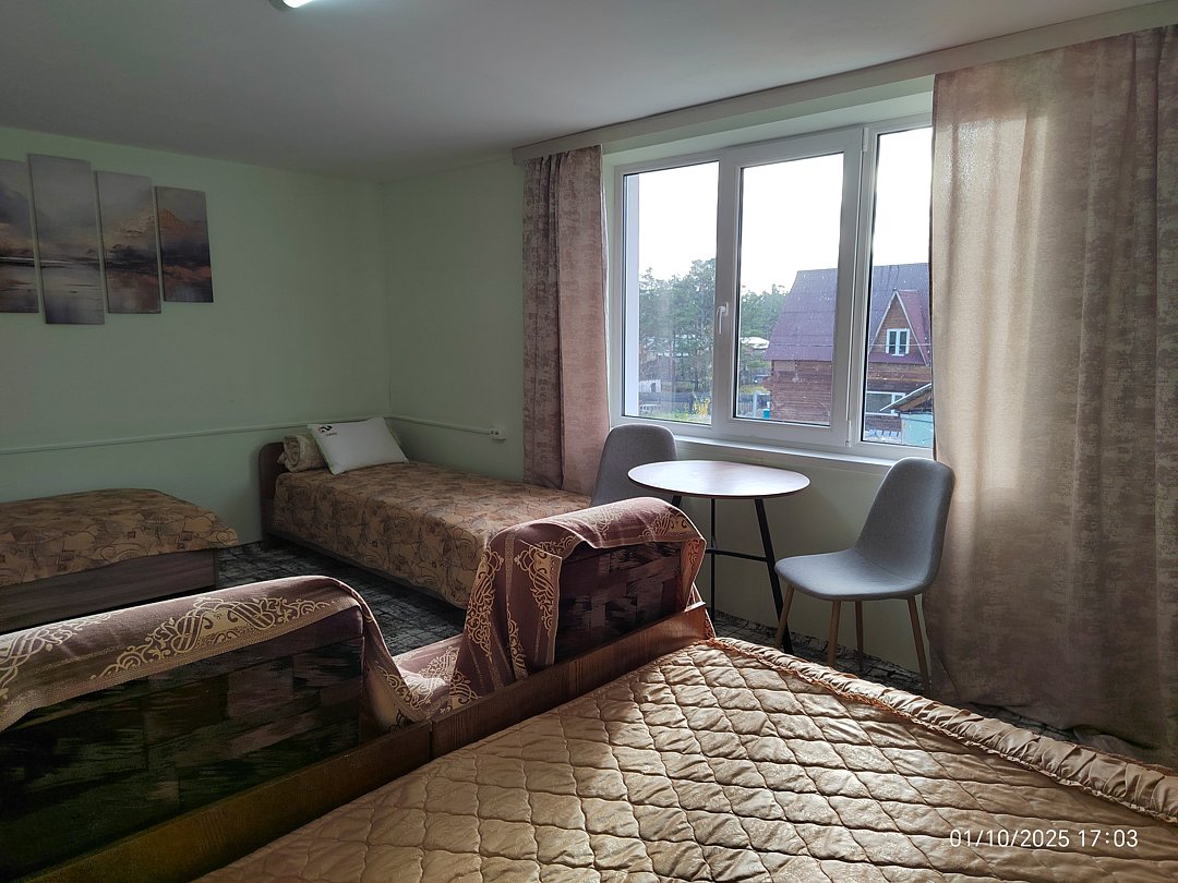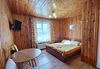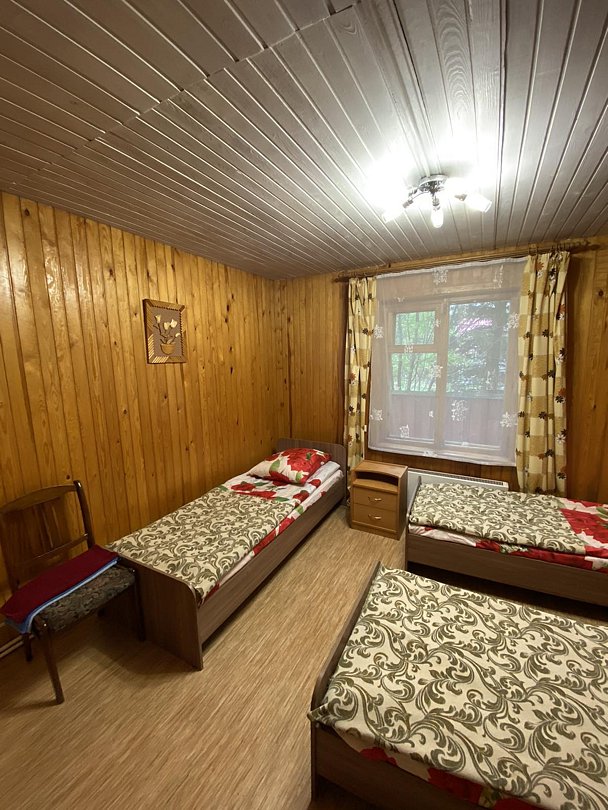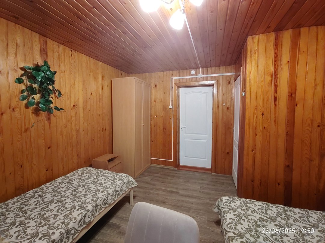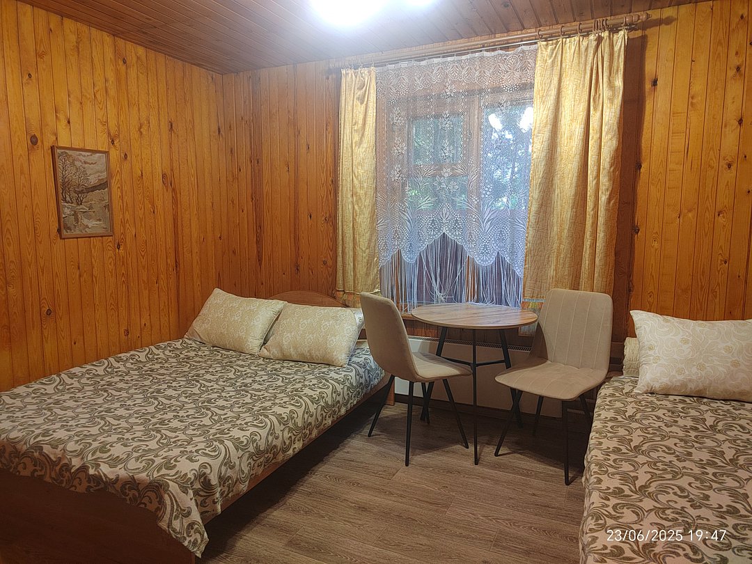 Двух-трёхместный номер на 1-м этаже с одноместной и полутораспальной кроватями. Есть баня-сауна с душем и с купелью. На территории беседки (одна из них с кухонной зоной), 5 метровый бассейн и сибирский чан, также есть мангальная зона с 3 мангалами, в т.ч. новый мангал с грилем. Автопарковка на территории.