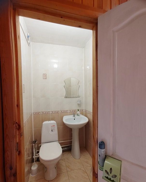 Туалет с раковиной в номере, душ отдельно (в тёплом помещении с выходом на заднее крыльцо дома). Также есть баня-сауна с душем и небольшим бассейном. Общая кухня со всем содержимым на 1 этаже.